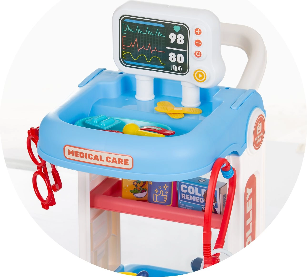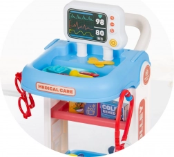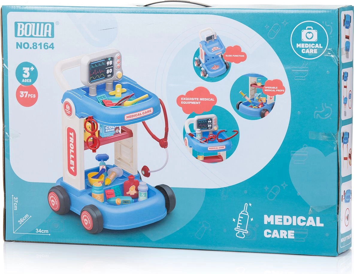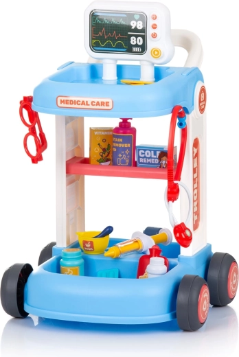 Denne lægesæt til børn med rullende vogn giver alt, hvad en lille læge behøver til sine første undersøgelser. Den stabile konstruktion med hjul og håndtag gør det nemt at flytte rundt i rummet, mens hylder og rum holder alle redskaber lige ved hånden. Takket være det omfattende udstyr kan børn afprøve grundlæggende lægeopgaver og træne empati og kommunikation.