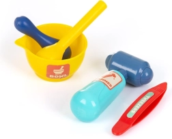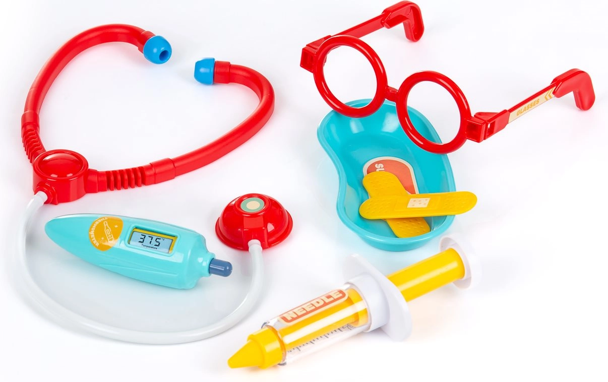 Stetoskop, termometer, sprøjte, saks og meget mere inspirerer børn til fantasifuld leg og til at lære grundlæggende handlinger fra lægeverdenen.