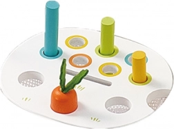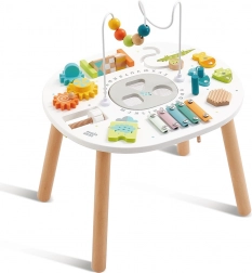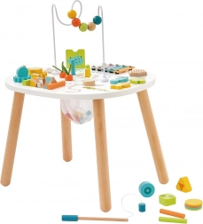 På bordpladen finder børnene forskellige stationer: en perlelabyrint med tråd, xylofon med kølle, roterende tandhjul, magnetisk fiskespil, indsætningslege med former og flere smarte elementer til træning af logik, tålmodighed og koordination. Med flere aktiviteter samlet ét sted forbliver legehjørnet overskueligt, og børnene kan nemt koncentrere sig.