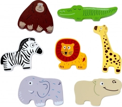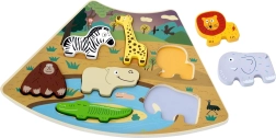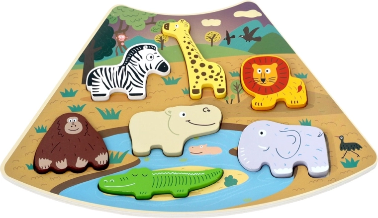 Træpuslespillet Safari er det ideelle legetøj til de første puslespil. De farverige og søde dyrefigurer – zebra, giraf, løve, gorilla/orangutang, flodhest, elefant og krokodille – har tykke, let gribbare former, som gør håndteringen nem for børn. Pladen med savannescene hjælper med rumsans og formgenkendelse, fordi hver brik har sin helt præcise plads.
