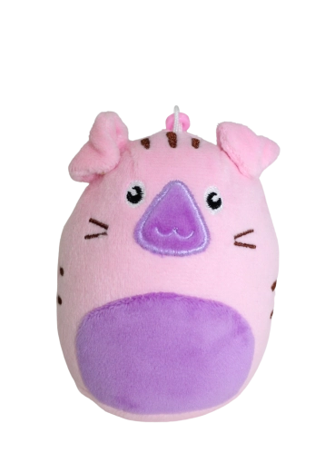 Lyserød gris med lilla mave og broderet ansigt er superblød, sikker og ideel til både kram og leg.