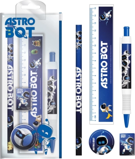 Praktisk skolesæt med licensen Astrobot indeholder alt, hvad du behøver til skrivning og måling. I det kompakte plastetui finder du en 15 cm lineal, en blyantspidser, et viskelæder, en kuglepen og en HB-blyant – ideel til skole og på farten.