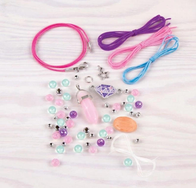 Der medfølger perler, der ligner krystaller, farvede perler og behagelige snore med mulighed for at justere størrelsen. Skabelsen er sjov både hjemme og på farten, og de færdige accessories er behagelige at bære hver dag.