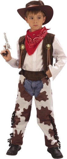 Stilfuld cowboy-kostume til børn i højden 120–130 cm forvandler enhver lille eventyrer til en helt fra Det Vilde Vesten. Indeholder alt det væsentlige for et autentisk look: vest, chaps, tørklæde og hat. Ideel til karneval, maskebal eller temafester.