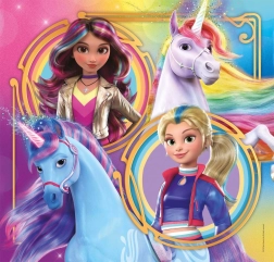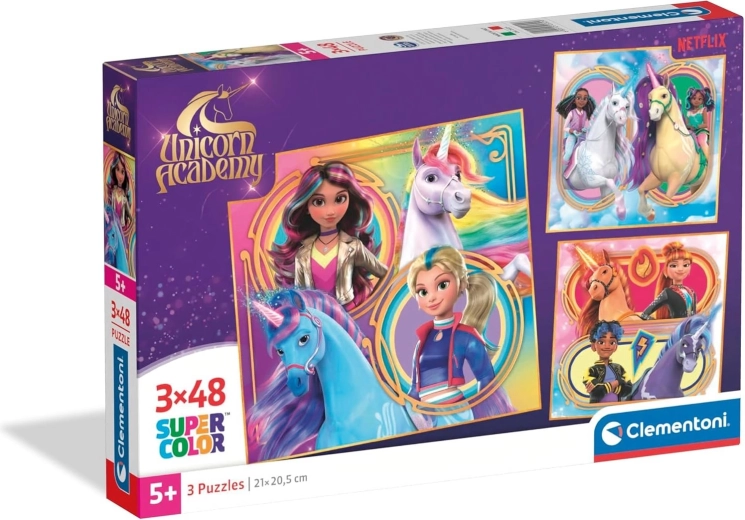 Fortryllende børnepuslespil med motivet Enhjørningeakademiet vil glæde enhver lille eventyr-elsker. Pakken indeholder 3 puslespil med 48 brikker, hvert måler efter samling cirka 21 × 20,5 cm. Kvalitetsprint, mættede farver og solide brikker understøtter tålmodighed, koncentration og finmotorik.