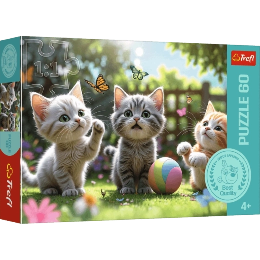 Opdag det charmerende motiv af tre søde killinger, der beundrer farverige sommerfugle. TREFL børnepuslespil med 60 brikker er et ideelt valg til de første puslespil – brikkerne passer godt sammen, overfladen af kalandreret papir reflekterer lyset blidt, og billedet er derfor overskueligt og indbydende at lægge.