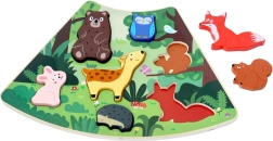 De kraftige træbrikker og præcise udskæringer lærer børn korrekt greb, øje–hånd-koordination samt genkendelse af former og dyr.