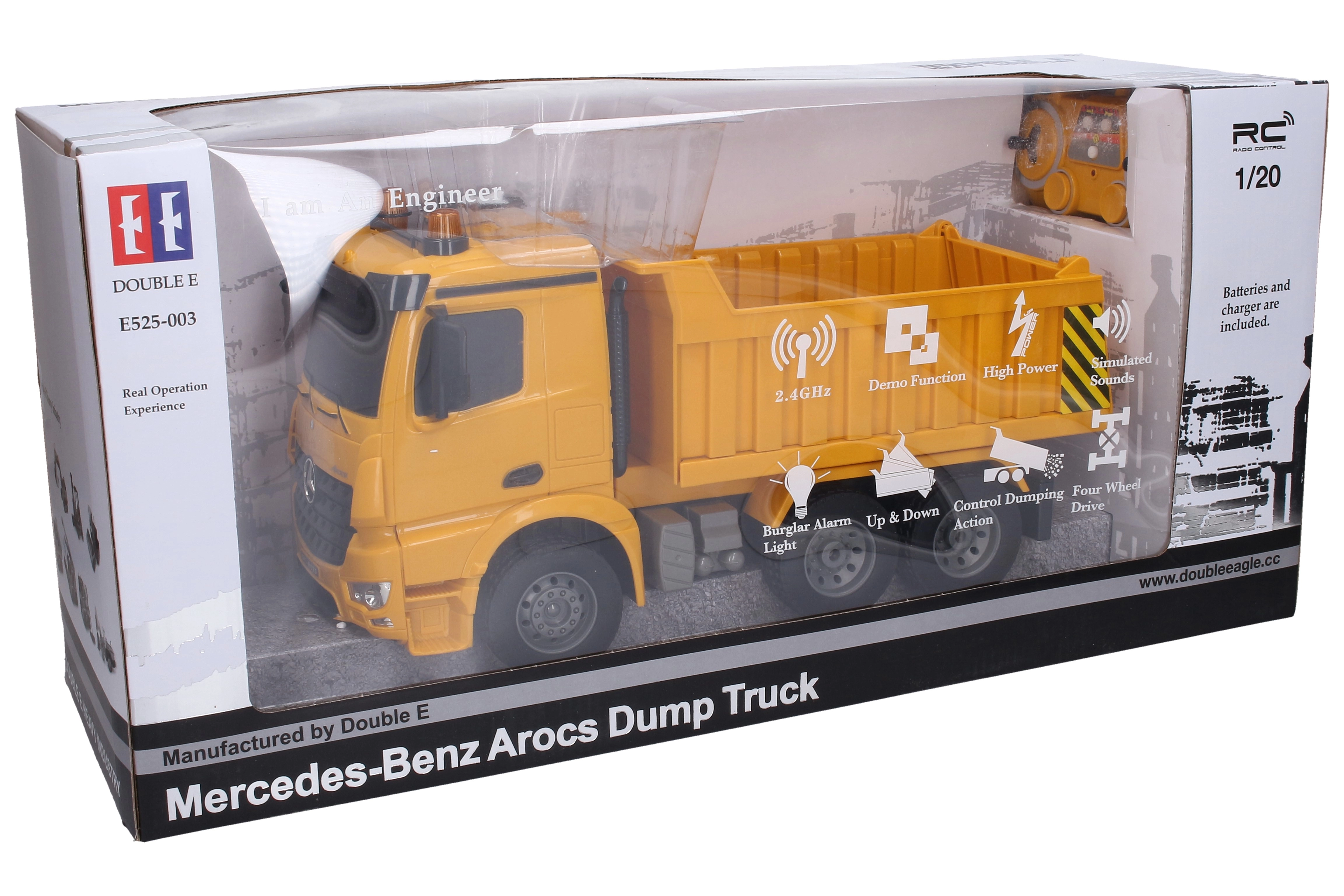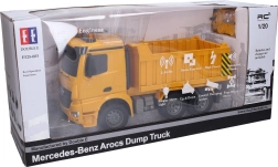 RC-tipvognen MERCEDES er et fremragende valg for små byggere og entusiastiske samlere. Takket være 2,4GHz-frekvensen er styringen stabil og uden interferens, mens lys- og lydeffekter øger den realistiske køreoplevelse. Den funktionelle lad gør det muligt at vippe og tippe lasten direkte fra controlleren.