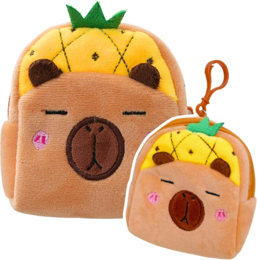 Denne søde plyspung med capybara og lille ananas-hætte fanger opmærksomheden ved første blik. Det bløde materiale er rart at røre ved, mens den praktiske lynlås holder mønter, sedler, nøgler og små accessories trygt på plads. Takket være plastikkarabinhagen kan du nemt sætte den på rygsæk, taske eller bæltestrop.