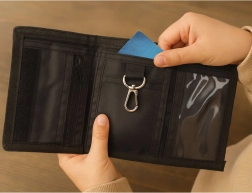 Takket være hurtig velcrolukning er alting sikkert lukket og samtidig lige ved hånden. Indvendigt finder børn en møntlomme med lynlås, seddelrum, et gennemsigtigt vindue til kort eller foto og en metalhægte/karabinhage til at fastgøre en nøgle eller et vedhæng.