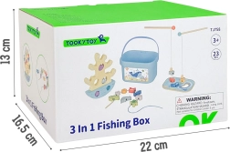 To træfiskestænger med magneter og farverige dyr forvandler bordet til et ocean. Børn øver præcision, tålmodighed og hånd-øje-koordination, mens de fanger efter former og farver.