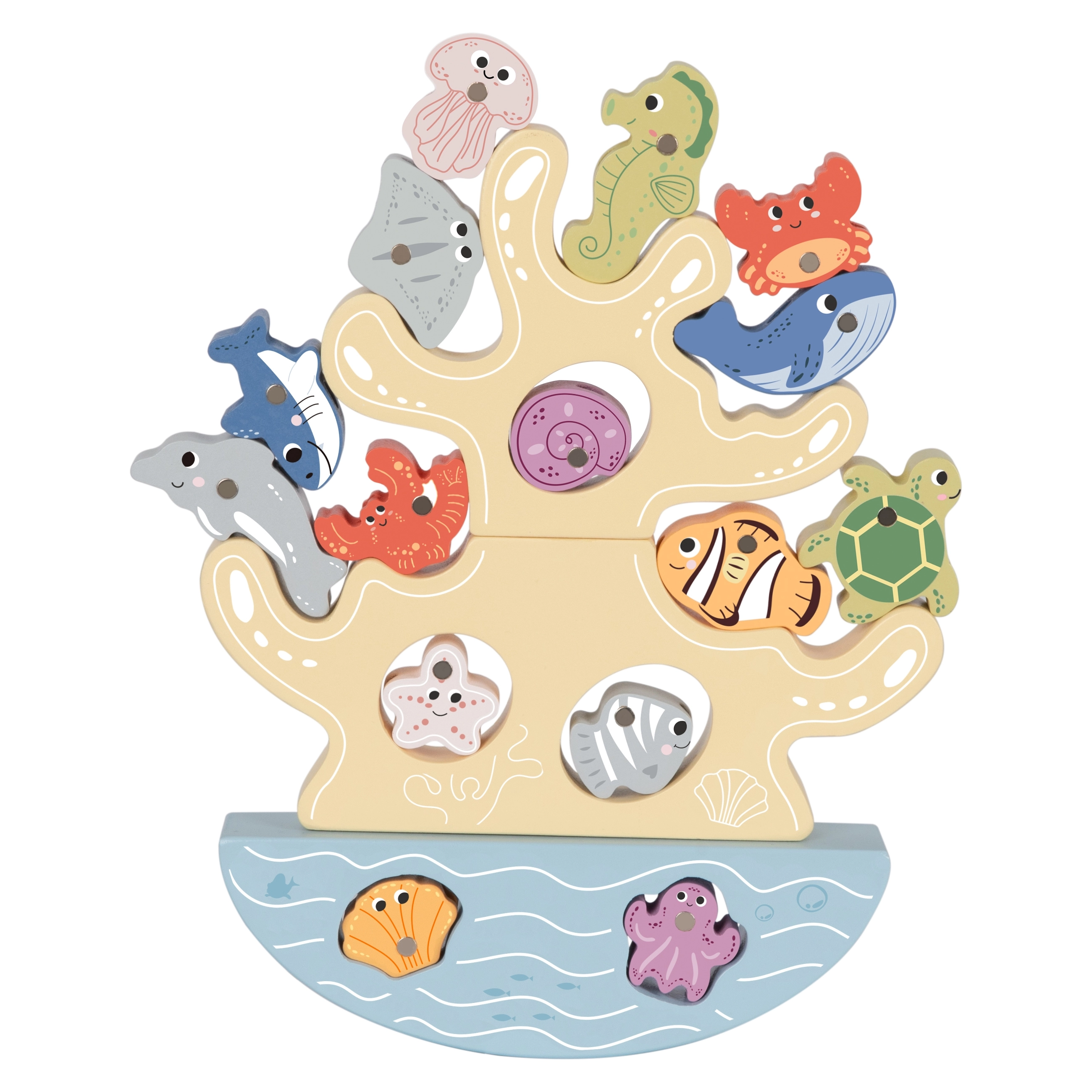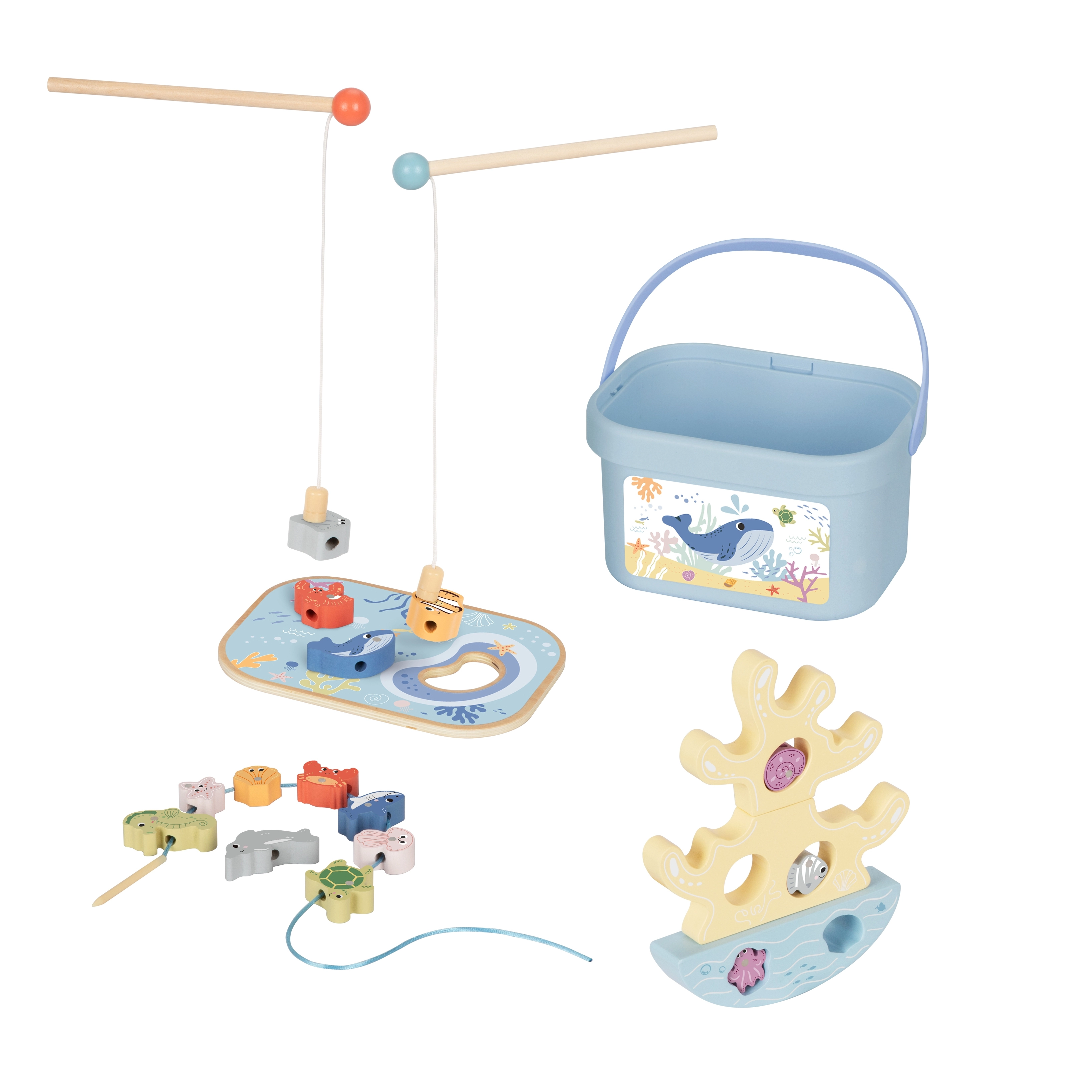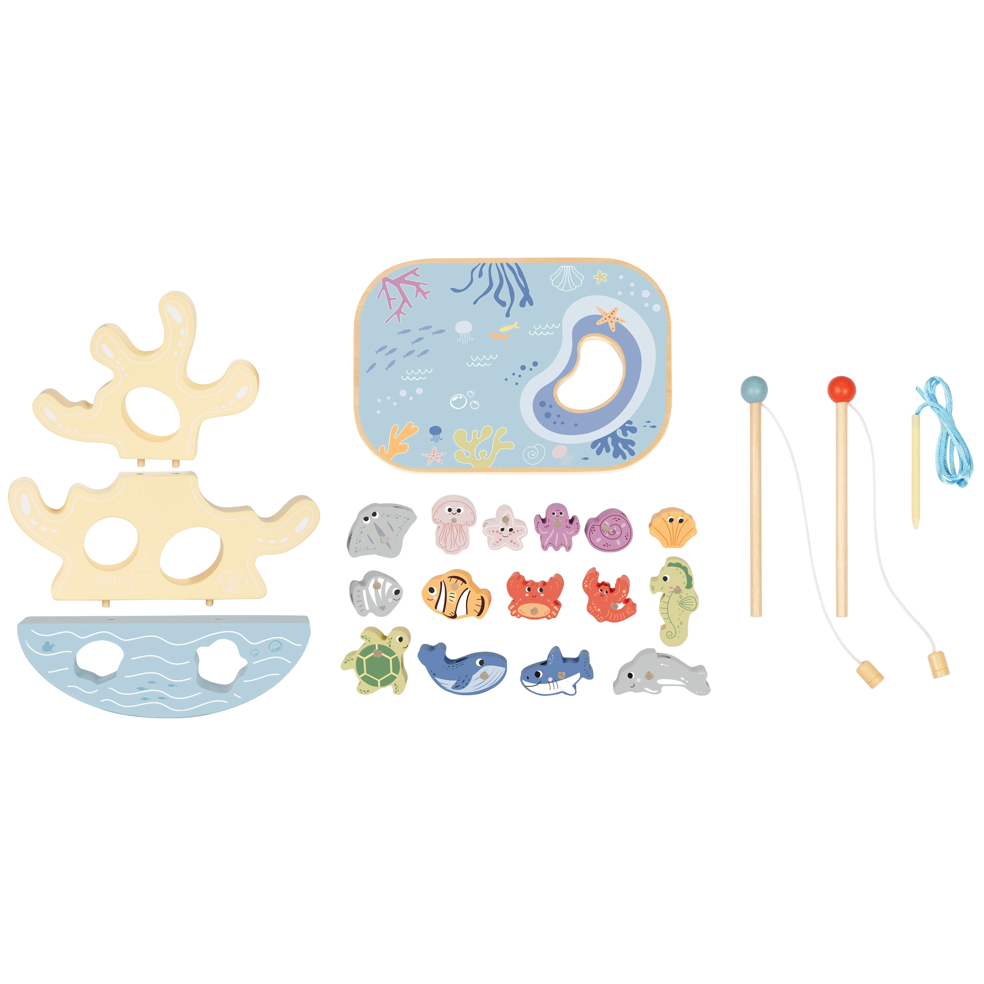 Dette kreative træsæt bringer et helt hav af sjov til børn i én pakke. To magnetiske stænger inviterer til at fange farverige fisk, et koral balancetårn træner tålmodighed og stabilitet, og en snoresæt med trænål udvikler finmotorik og koncentration. Delene har behageligt afrundede kanter og passer til børnehænder.