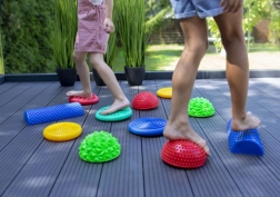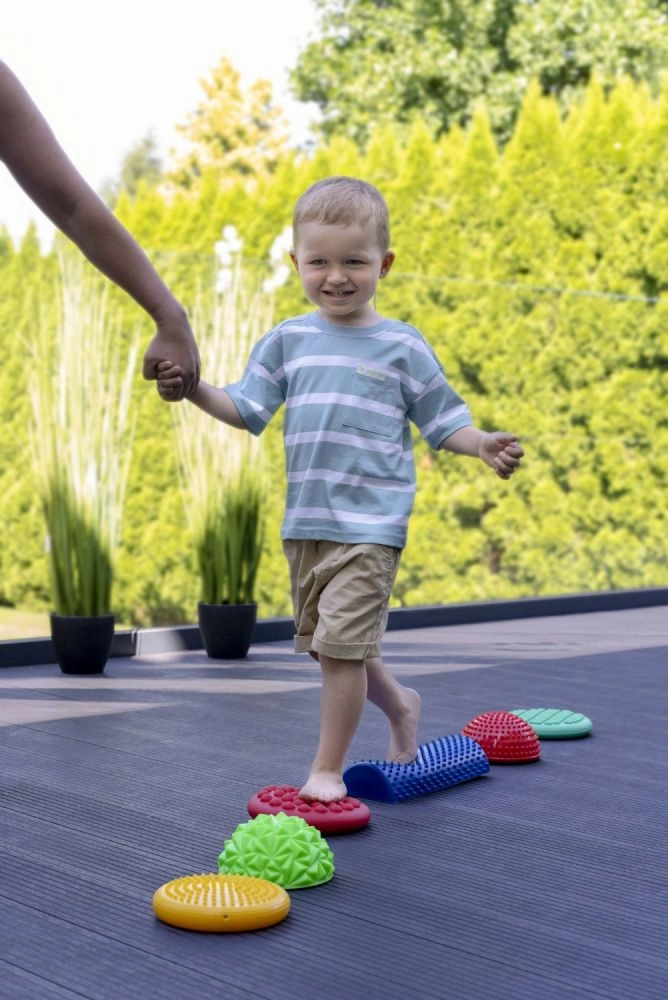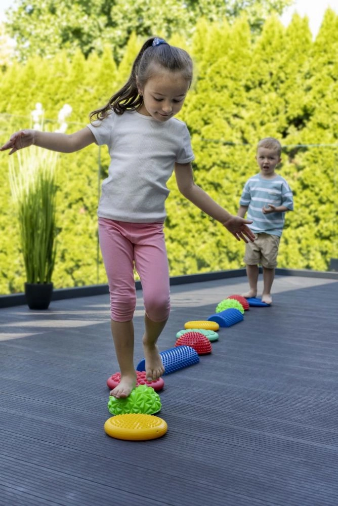 Sættet med seks farverige elementer med knopper og riller er designet til barfodsgang, stabilitetstræning og udvikling af grovmotorik. Skridsikre teksturer øger skridtsikkerheden og aktiverer naturligt musklerne i fødder, ankler og kropskernens stabilitet. Takket være den modulære opbygning kan du skabe en lige bane, slalom eller en forhindringsbane.