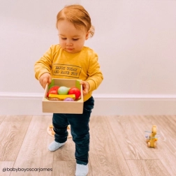 Efter endt leg kan frugterne let gemmes tilbage i kassen, som er beskyttet af et skydelåg. Dette trælegetøj er lavet af kvalitetsmaterialer, der er ansvarligt fremskaffet og overholder de nuværende europæiske sikkerhedsstandarder.