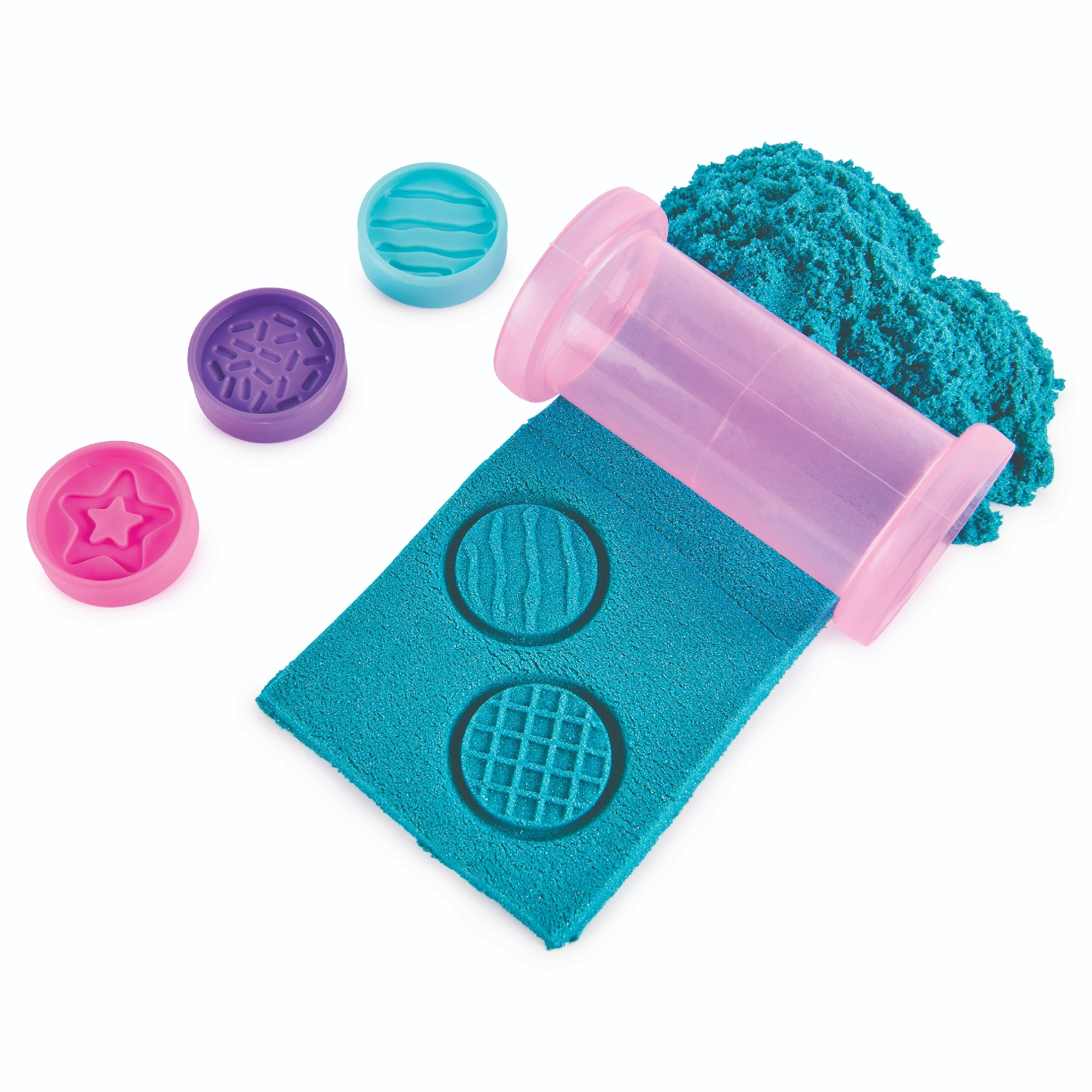 Kagerullen og de runde stempler laver detaljerede mønstre i sandet – stjerner, gitter eller bølger. Sandet klistrer kun til sig selv, så oprydning er legende let.