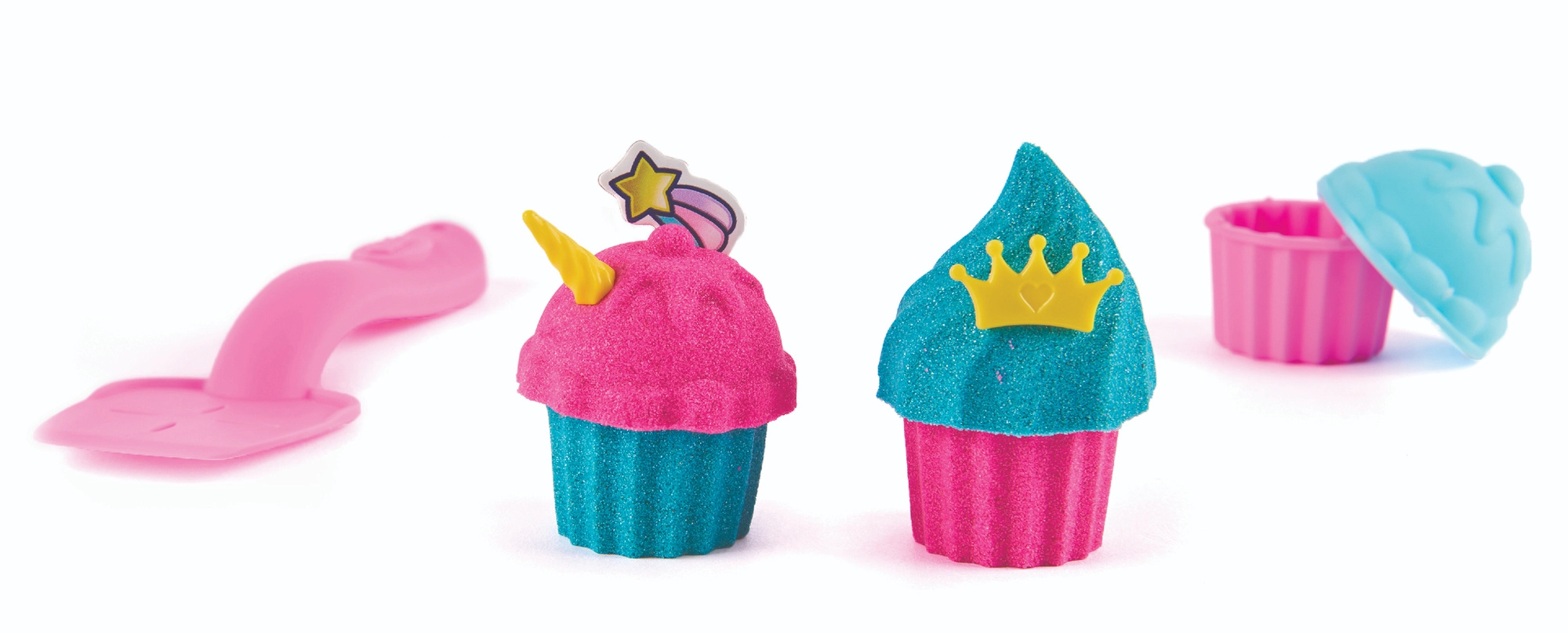 Pres dejen, lav forme og pynt med enhjørningedekorationer. To sandfarver gør det muligt at lægge lag af “dej” og “glasur” præcis som i et rigtigt konditori.