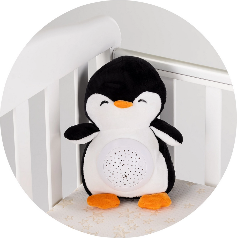 Denne bløde pingvin med indbygget projektor og musikmodul skaber en stjernefyldt nattehimmel på væggene og hjælper med blide melodier børn med at falde roligt i søvn. Med et enkelt tryk på en knap sættes projektoren i gang og laver en imponerende farveprojektion, der dæmper stemningen før sengetid.