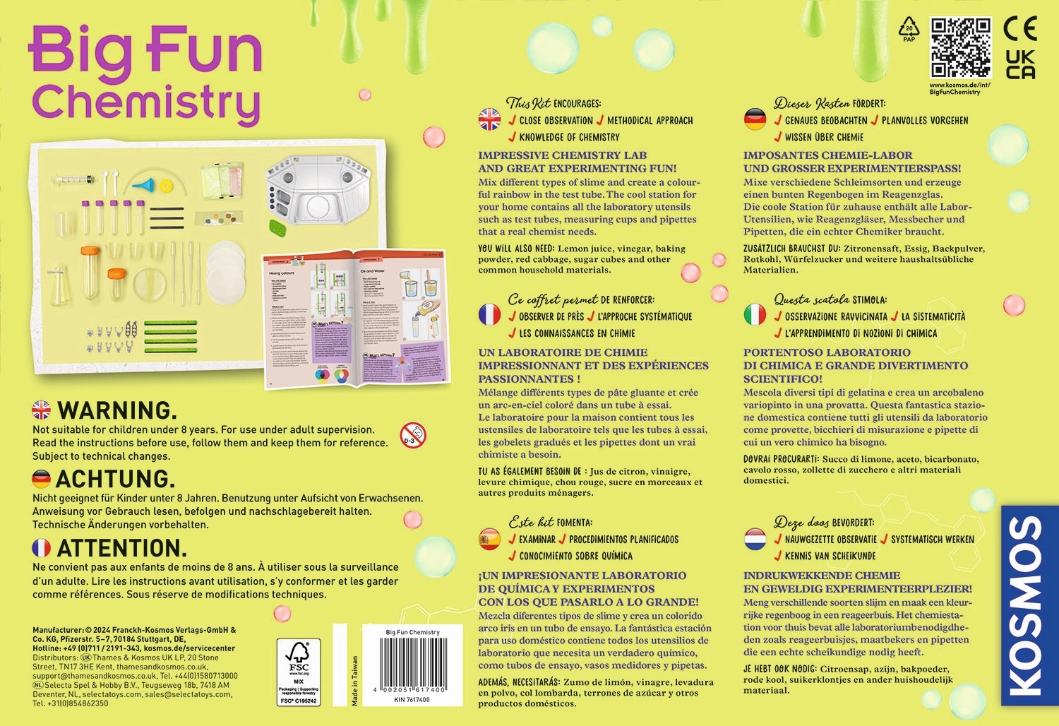 Oplev sjov med kemi derhjemme! Dette læringssæt fra KOSMOS bringer 20 sjove eksperimenter til børn i alderen 8–12 år. Indeholder alt, hvad der er nødvendigt til de første forsøg – reagensglas, pipetter, flasker og andet tilbehør, samt en dansk vejledning til download via QR-kode.