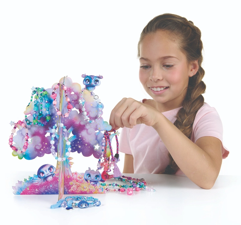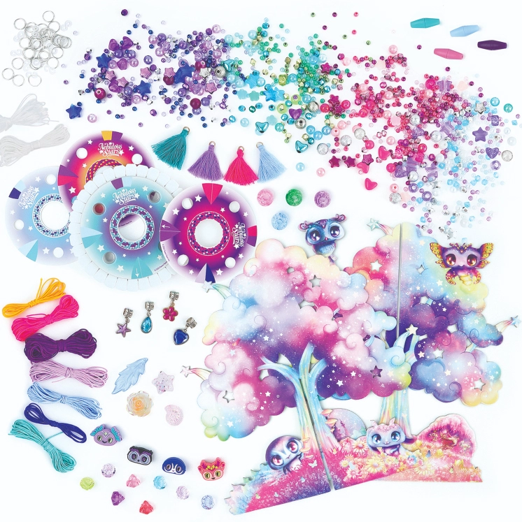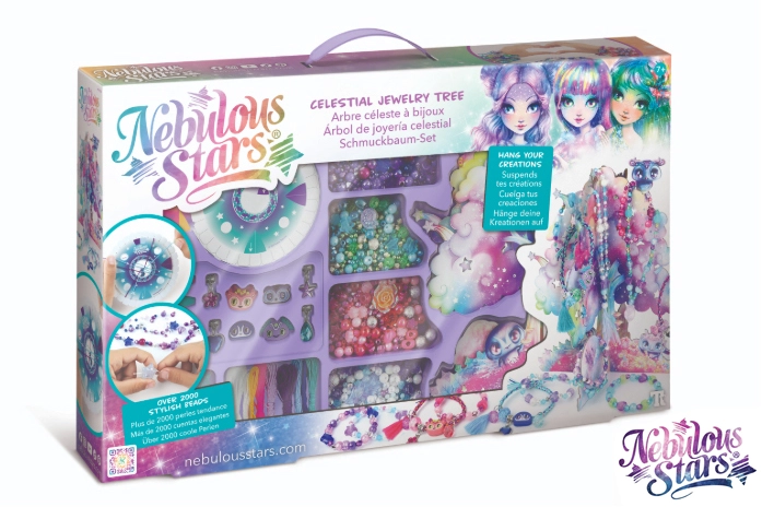 Skab dine egne unikke armbånd og halskæder med det magiske sæt Nebulous Stars. Sættet indeholder et dekorativt Stjernetræ til udstilling af færdige smykker, over 2000 perler, farvede snore og vedhæng til uendelig kreativitet. Den perfekte gave til små skabere, der elsker perler og fantasi.