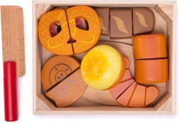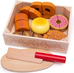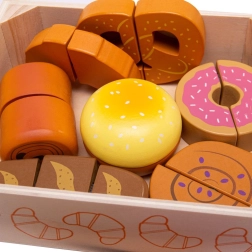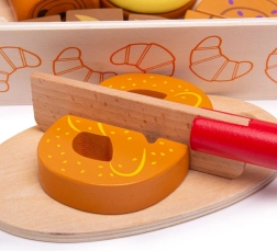 Vi præsenterer træskæresættet til bagværk, som er designet til alle børn, der ønsker at udforske køkkenets magiske verden. Dette farverige sæt inkluderer forskellige former for bagværk som croissanter, donuts og brød, der kan "skæres" med den medfølgende trækniv. Legetøjet er lavet af kvalitets træ og forbundet med velcro, hvilket muliggør interaktiv og realistisk leg.
