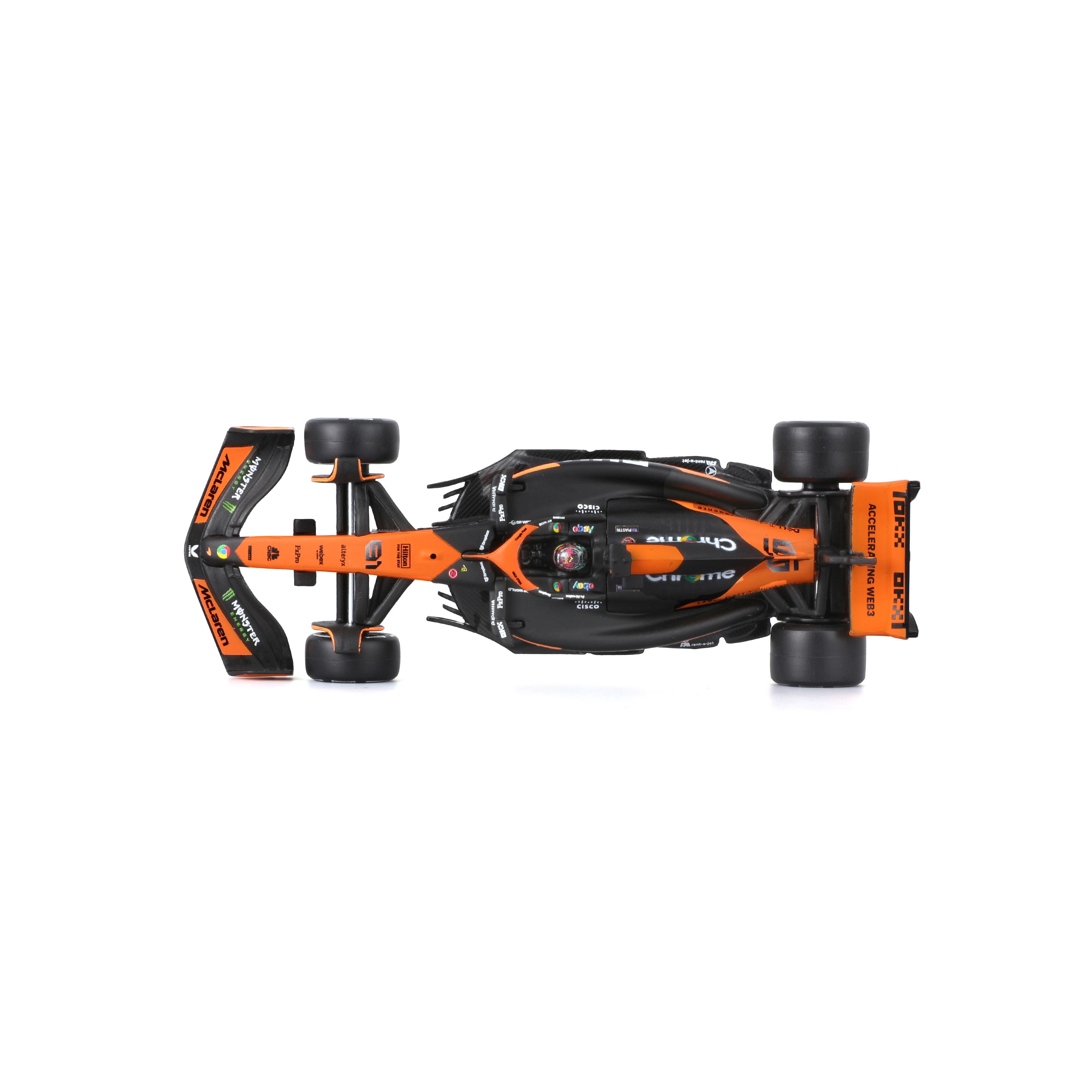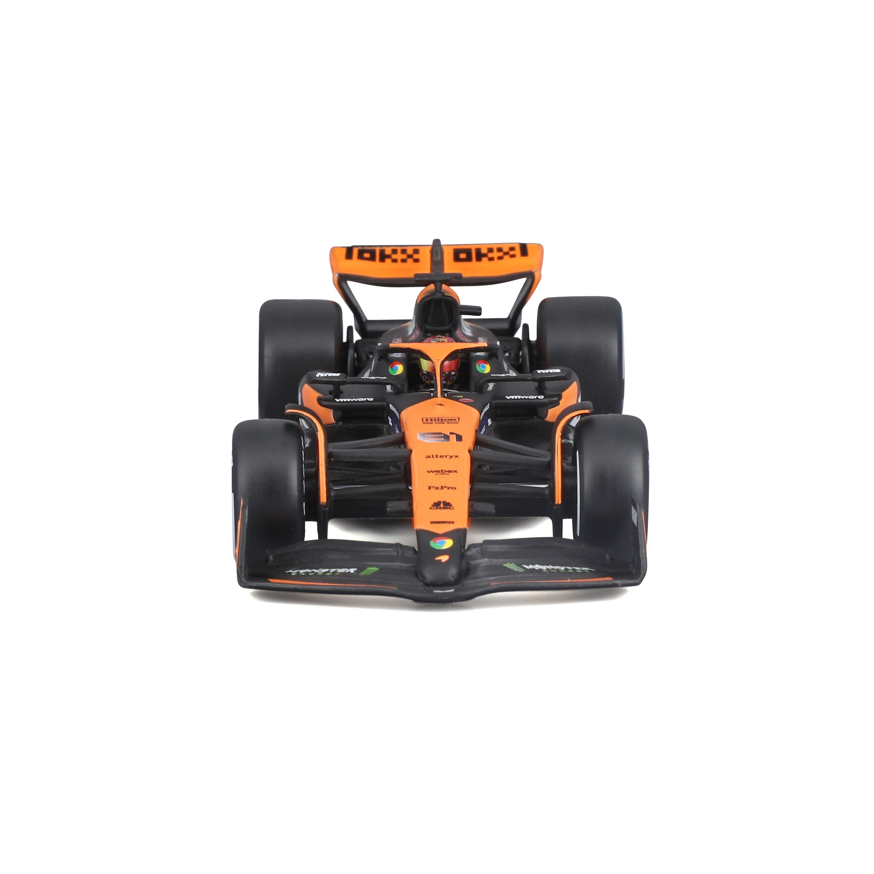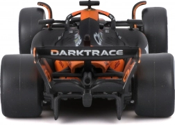 Tro orange‑sort bemaling, præcise teamlogoer og farvede hjulnav fremhæver den racerprægede karakter fra den ægte F1‑bil.