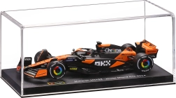 Klart låg på sort sokkel med teksten “McLaren MCL38 - Miami Grand Prix 2024” beskytter modellen mod støv og gør det muligt at udstille den fra alle sider.