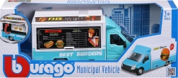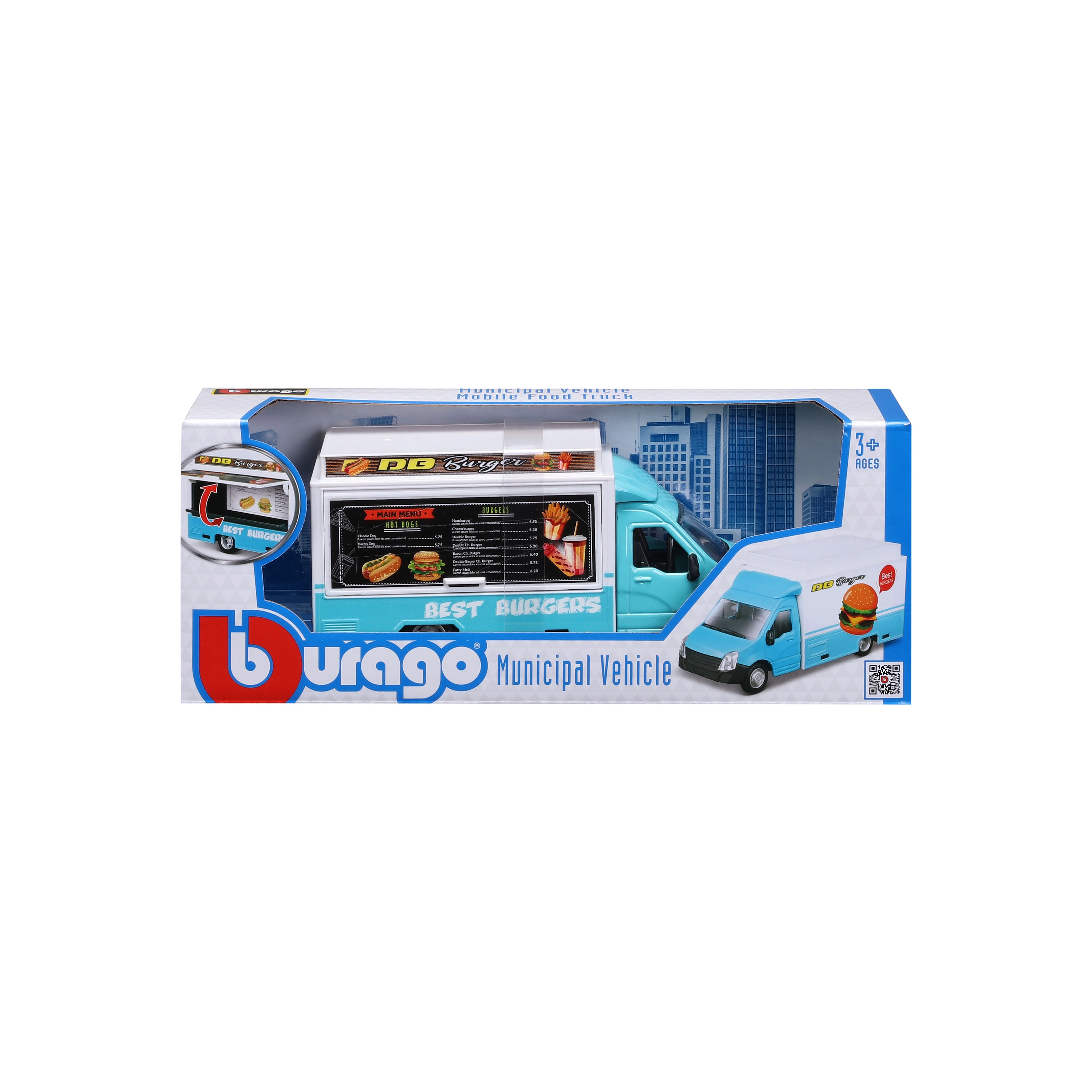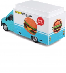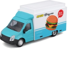 Oplev charmen ved byens serviceliv med en detaljeret model af en burger-foodtruck i skala 1:43. Kombinationen af turkis kabine og hvid overbygning med markant “Best Burgers”-grafik fanger opmærksomheden ved første øjekast. Takket være friløbshjul og glat kørsel er bilen klar til actionfyldt leg eller udstilling på hylden.