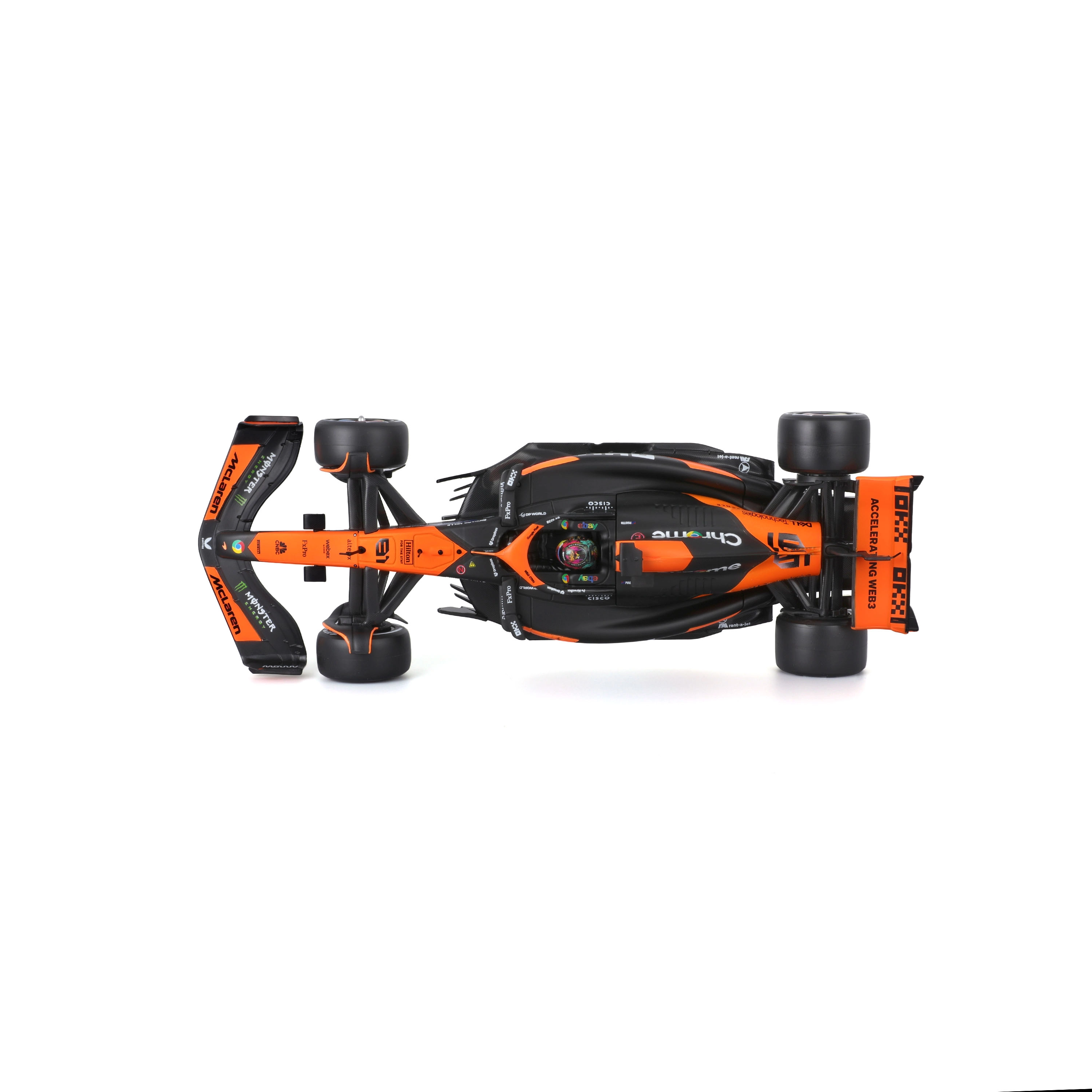 Den officielle orange‑sorte livery med sponsorlogoer giver modellen et professionelt racelook.