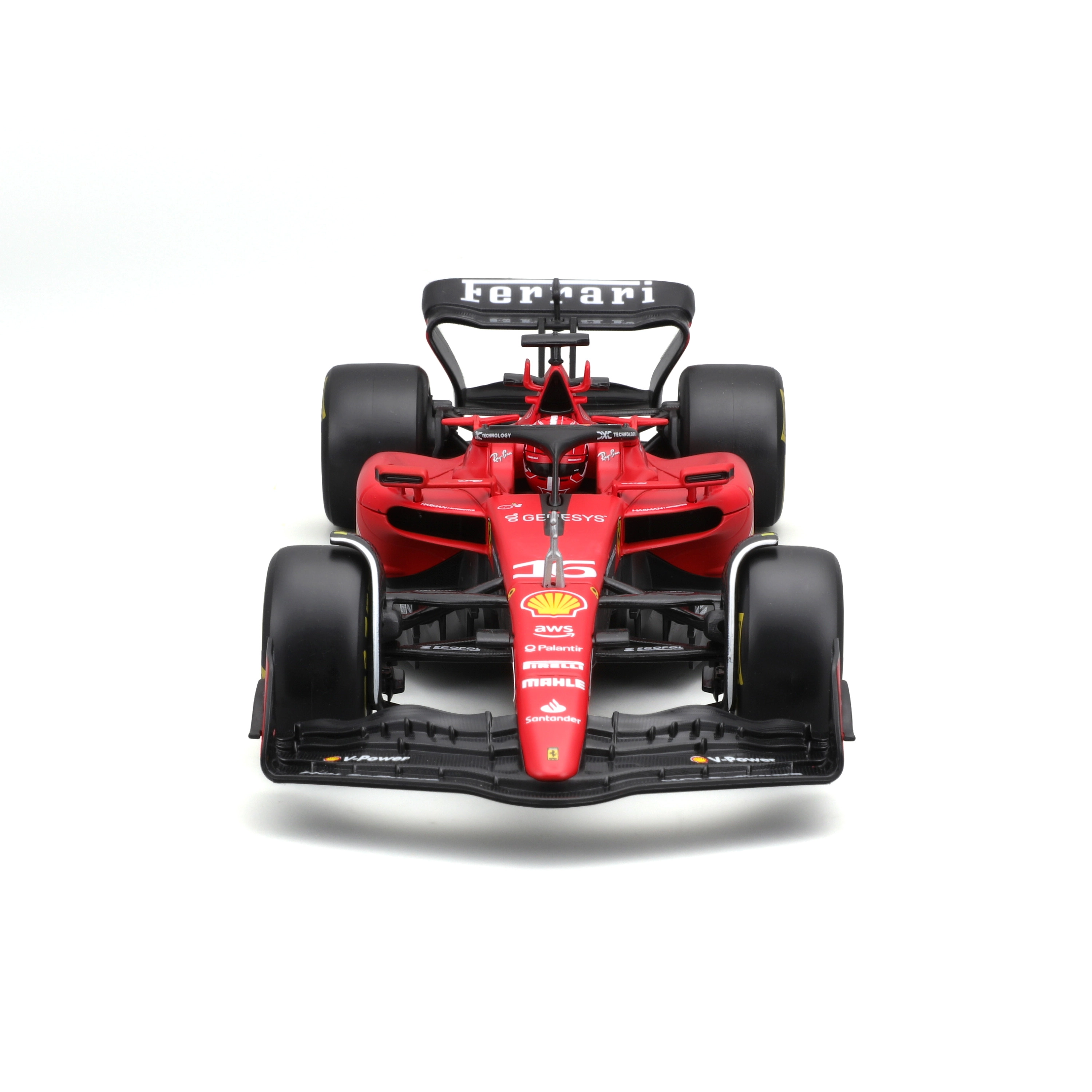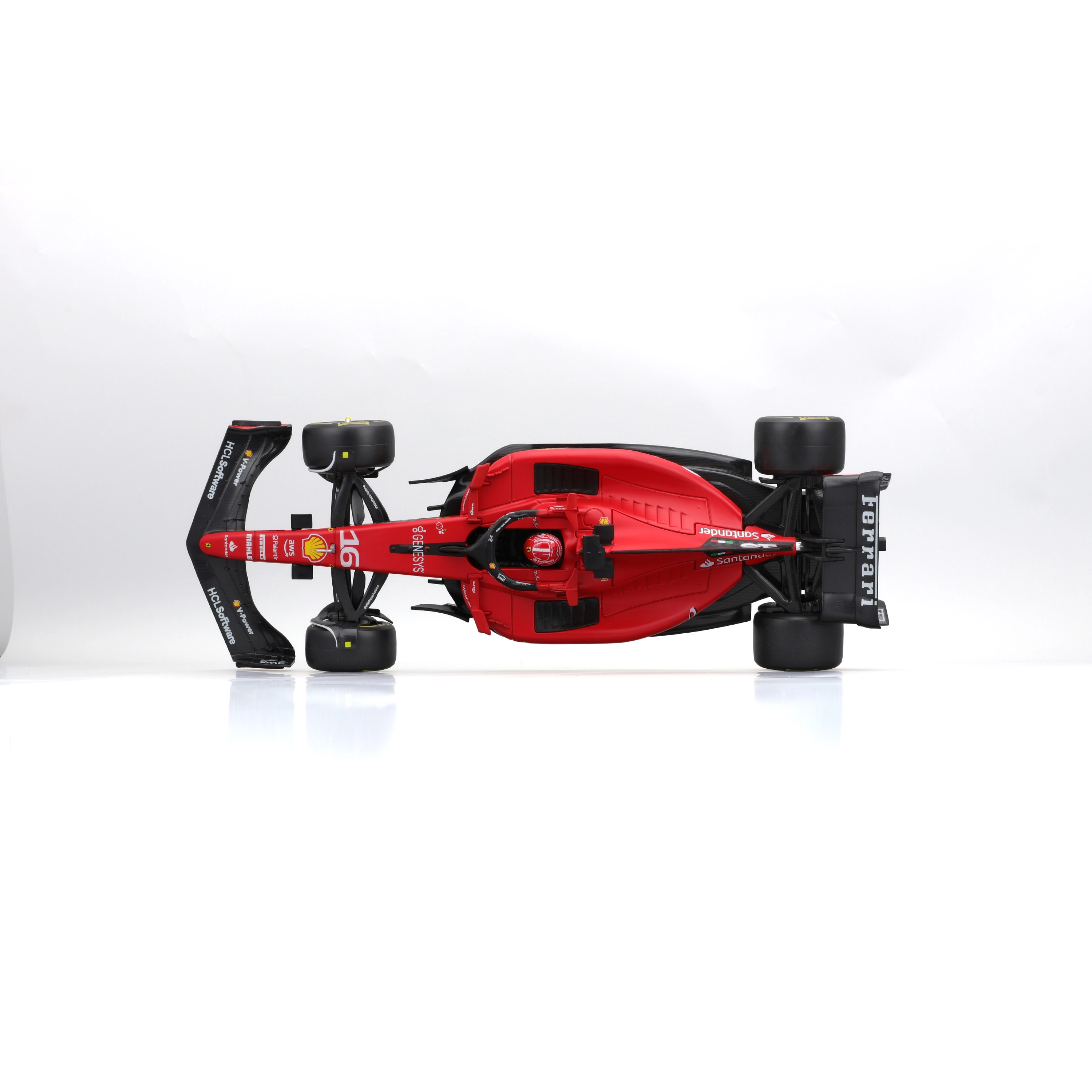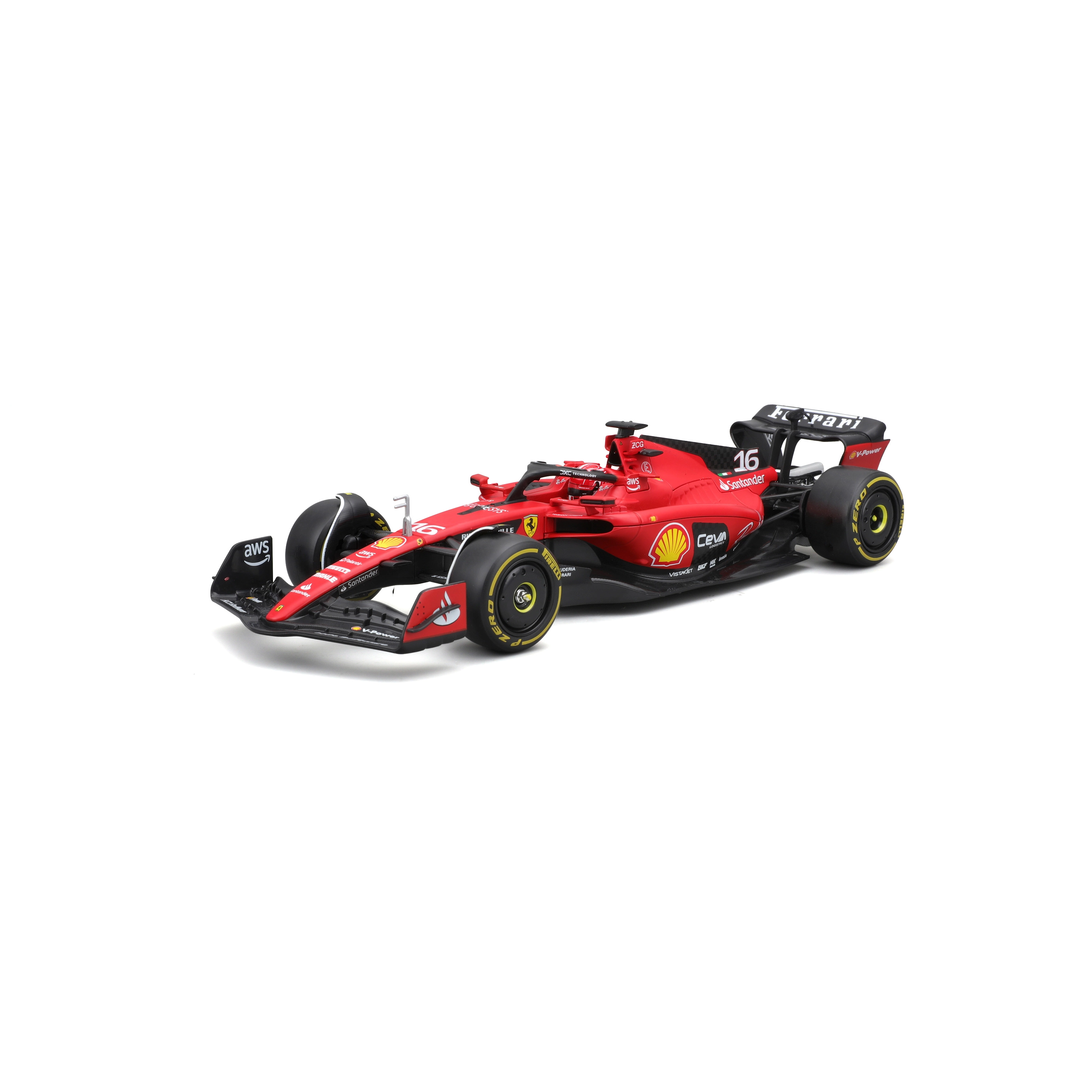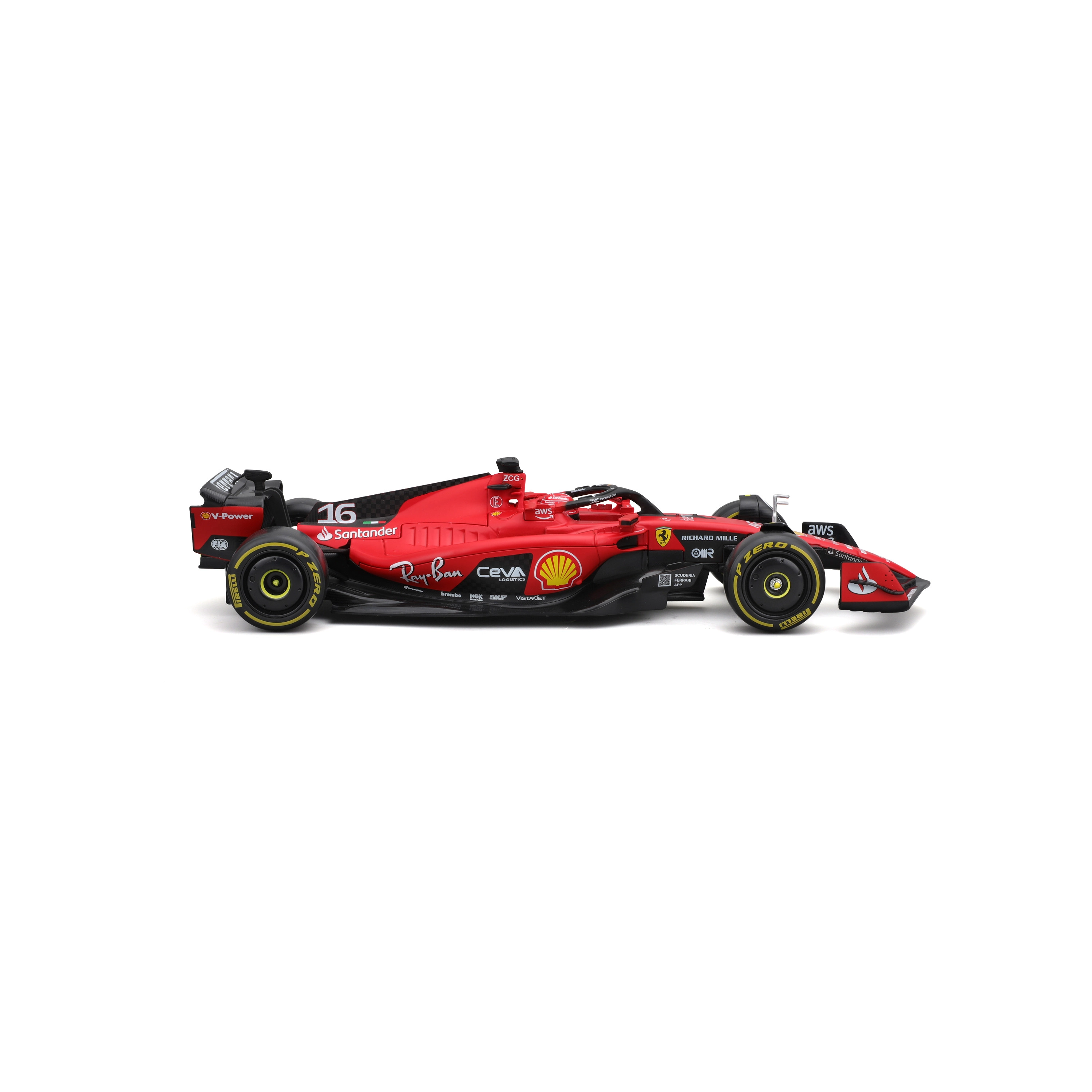 Trofaste karrosseriformer, aerodynamiske vinger, halo og præcise sponsortryk med nummer 16 til fans af Charles Leclerc.