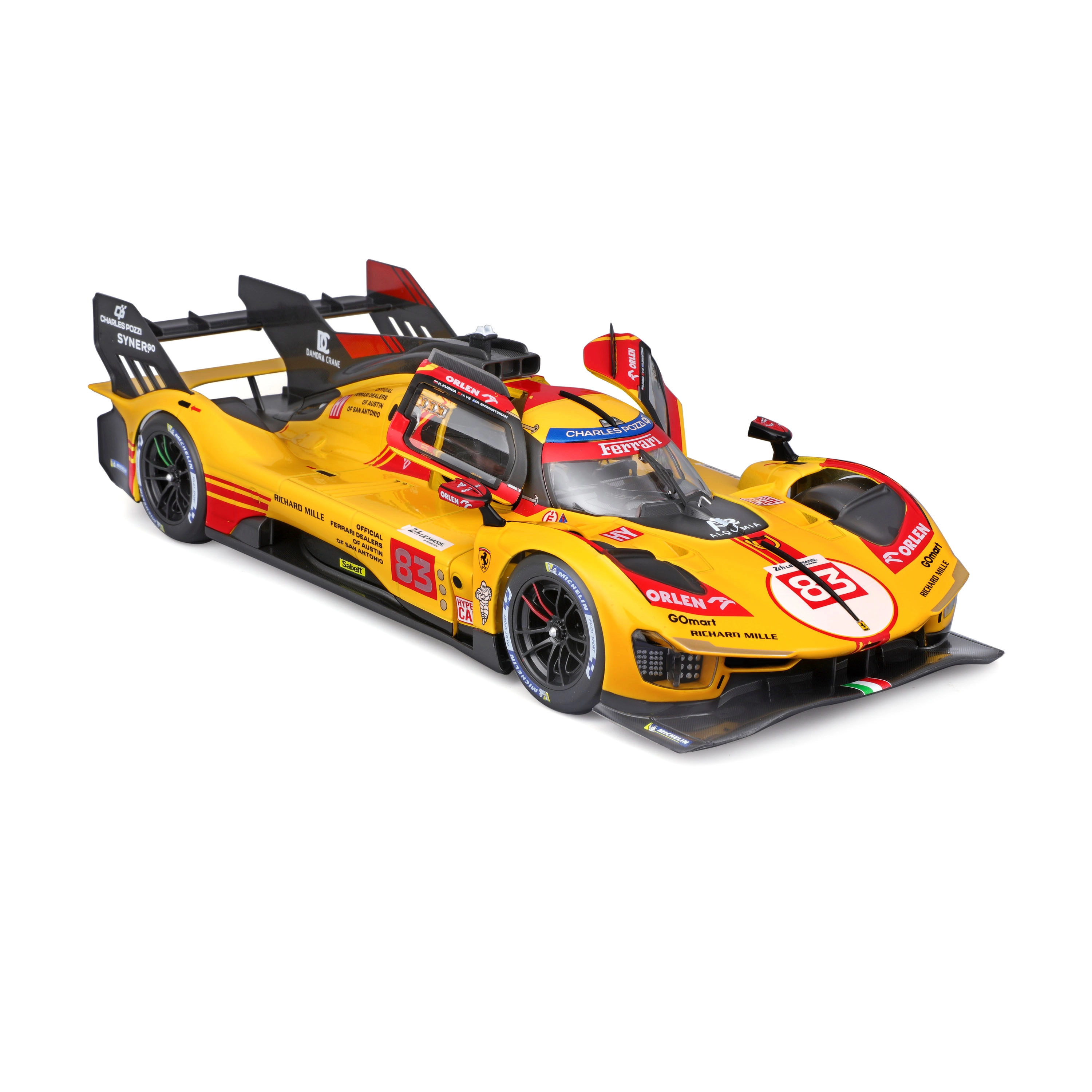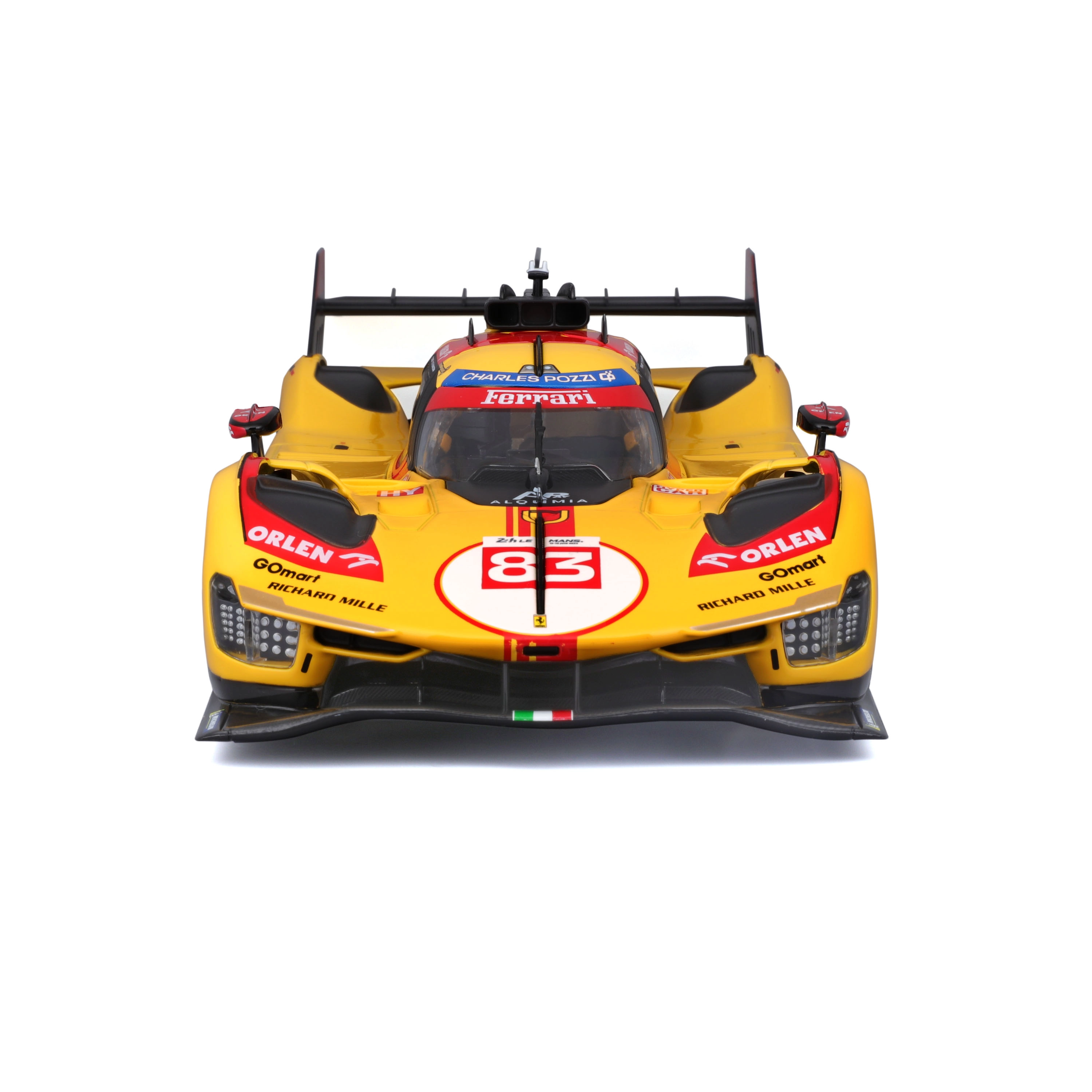 Oplev den førsteklasses model af Ferrari 499P i ikonisk gul-rød bemaling med startnummer 83 fra det berømte løb 24H Le Mans 2024. Metaludførelse med præcis finish, tro gengivet aerodynamik og realistiske bremseskiver understreger den autentiske fremtoning af racerspecialet.