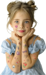 Giv børnene kreativ underholdning med et sæt midlertidige tatoveringer fuld af farver og fantasi. Påføringen er hurtig og nem: læg det valgte motiv på huden, fugt i cirka 20 sekunder og fjern papiret – resultatet er øjeblikkeligt og effektfuldt. Tatoveringerne holder typisk i 3–5 dage og kan til enhver tid nemt fjernes med sæbe og varmt vand.