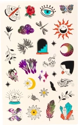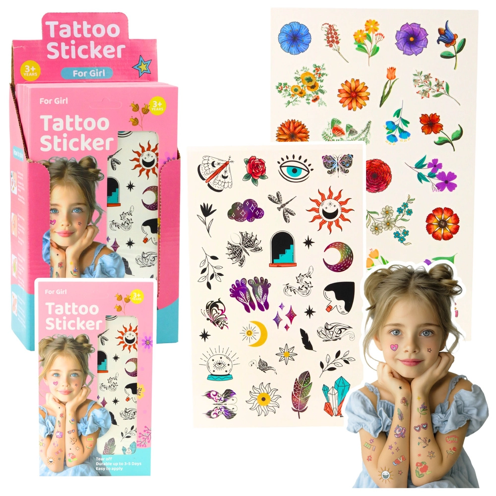 Et festligt sæt midlertidige tatoveringer til børn med op til 60 forskellige designs – hjerter, stjerner, blomster, måner og andre eventyrlige motiver. Tatoveringerne er nemme at påføre, sikre for børns hud og holder i 3–5 dage. De kan nemt vaskes af med sæbe og varmt vand, ideelt til fester, fødselsdage eller temalege.