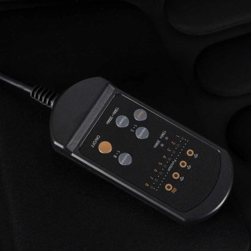 Med den overskuelige fjernbetjening vælger du mellem 8 programmer, indstiller 3 intensitetsniveauer og aktiverer timer på 15 eller 30 minutter. Strømforsyning leveres både af netadapter (AC 110–230 V) og 12 V biladapter, så du har afslapning til rådighed hvor som helst.