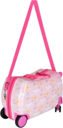 Kuffertens konstruktion gør det muligt for barnet at sidde komfortabelt og blive trukket med en rem. Stabile sider og fodstøtter øger komfort og sikkerhed.