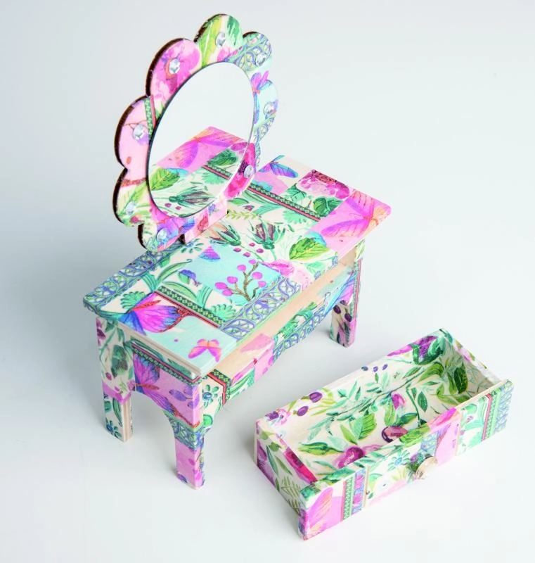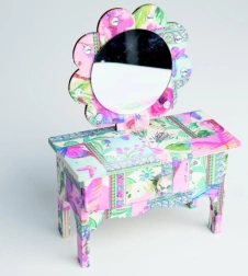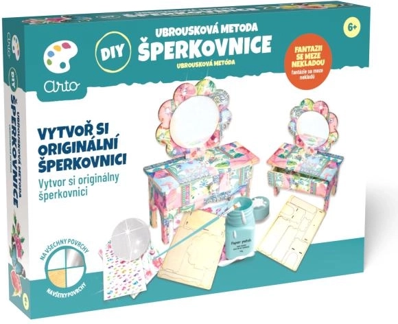 Saml et stilfuldt smykkeskrin formet som et lille toiletbord, og pynt det med den populære servietteknik. ARTO-sættet tilbyder en enkel proces fra samling til den endelige dekoration, så du får både skabelsesglæde og et flot resultat.