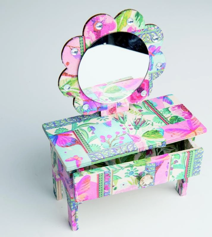 Fremgangsmåden er enkel: Først samler du trædelene til en lille kommode, derefter overfører du motiverne fra servietterne med lim, og til sidst pynter du med sten. Et godt valg til kreativ afslapning, udvikling af finmotorik og original hjemmedekoration.