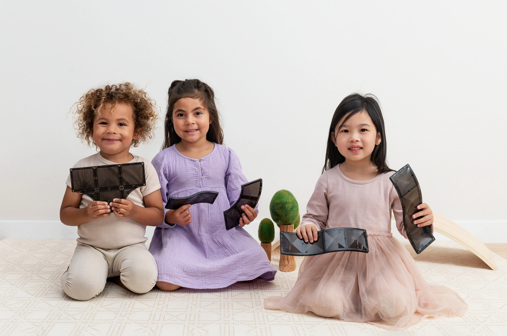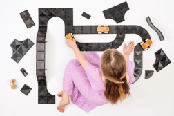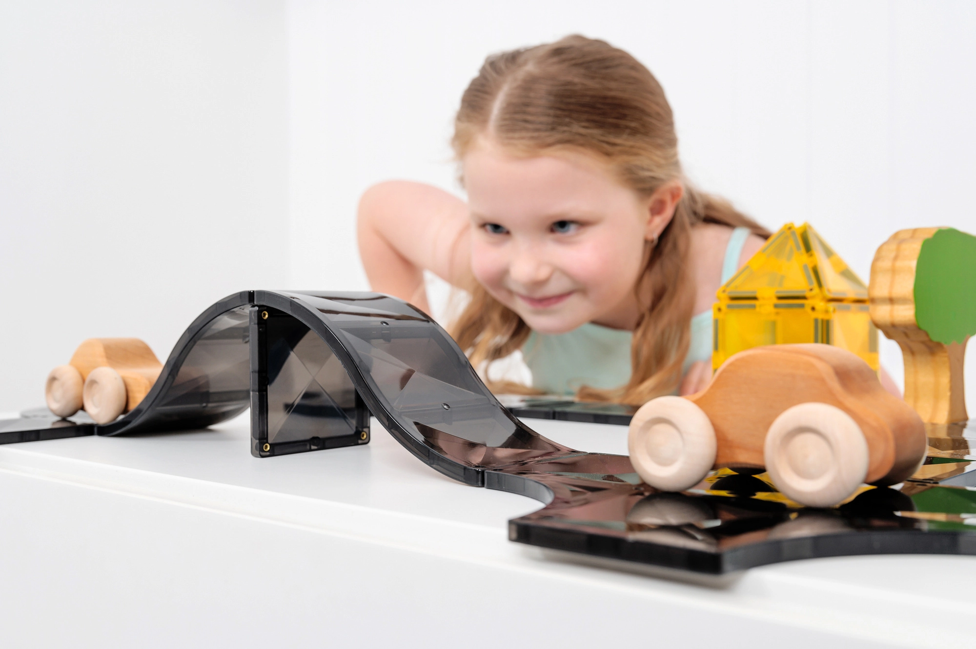 Sættet Connetix Roads Creative Pack bringer gennemsigtige, robuste vejdele i en elegant mørk farve, som passer ubesværet sammen takket være stærke neodymmagneter. Børn kan bygge ramper, sving, kryds og broer og køre på dem med træbiler. Under legen træner de naturligt logisk tænkning, motorik og grundlæggende fysik og geometri.