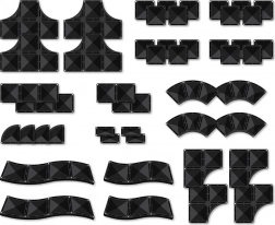 - 4× rampe, 4× sving, 4× T-stykke, 4× kryds R, rektangulære og kvadratiske dele, 4× kvartcirkel, 4× små rektangler, illustreret inspirationsbog