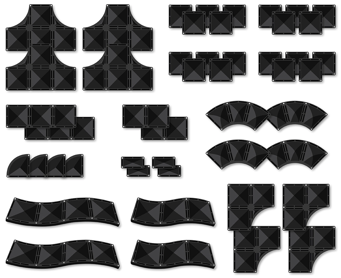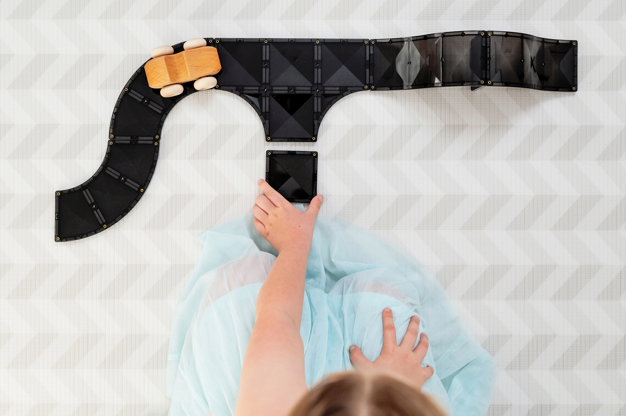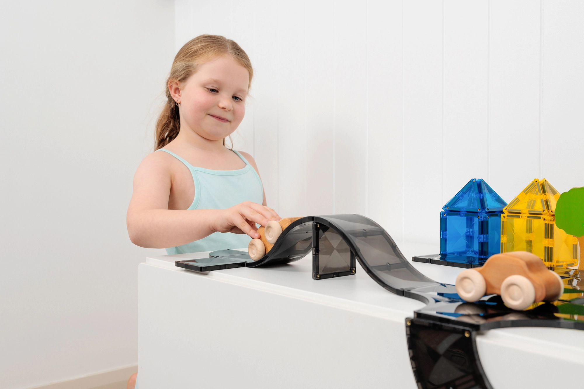 Kombinér ramper, sving, T-stykker og kryds i valgfri layouts. Den magnetiske samling er hurtig, solid og sjov takket være det tilfredsstillende “klik”.