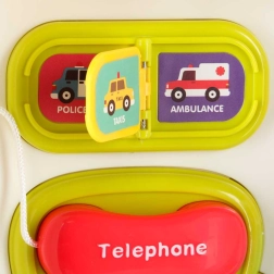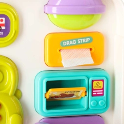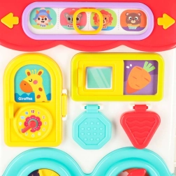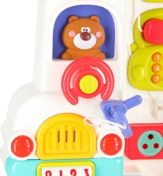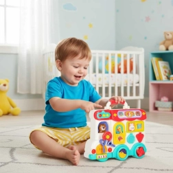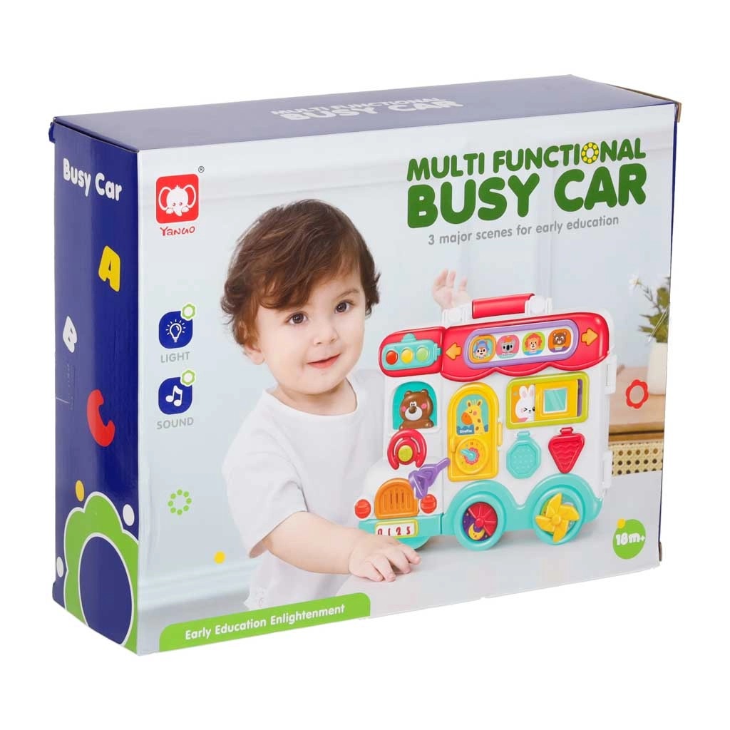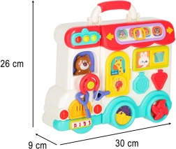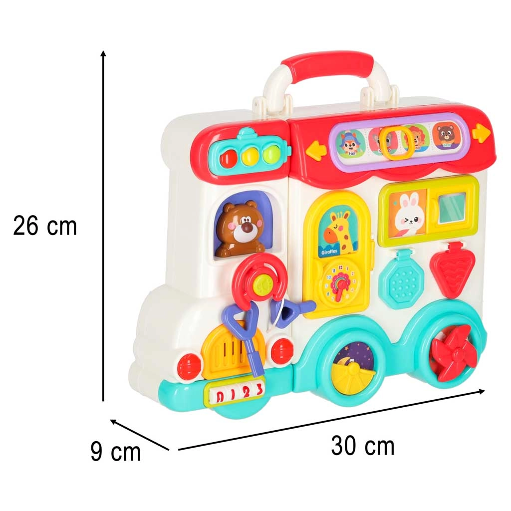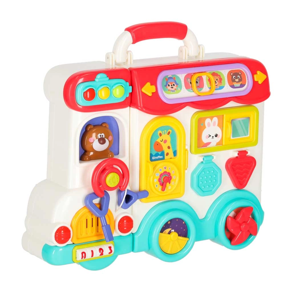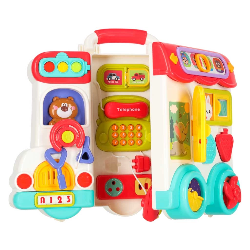 Denne interaktive læringsbus i praktisk kuffertformat er et mobilt opdagelsescenter. Børn kan dreje rattet, trykke på hornet med lyseffekt, skubbe vinduer, afsløre færdselsskilte, indstille viserene på uret og lære dyr at kende. Ved at vende til den anden side forvandles den til et logisk og sansemæssigt panel med telefon, mikroovn, “køleskab” med lille lys samt træning i rigtig sortering og parring.