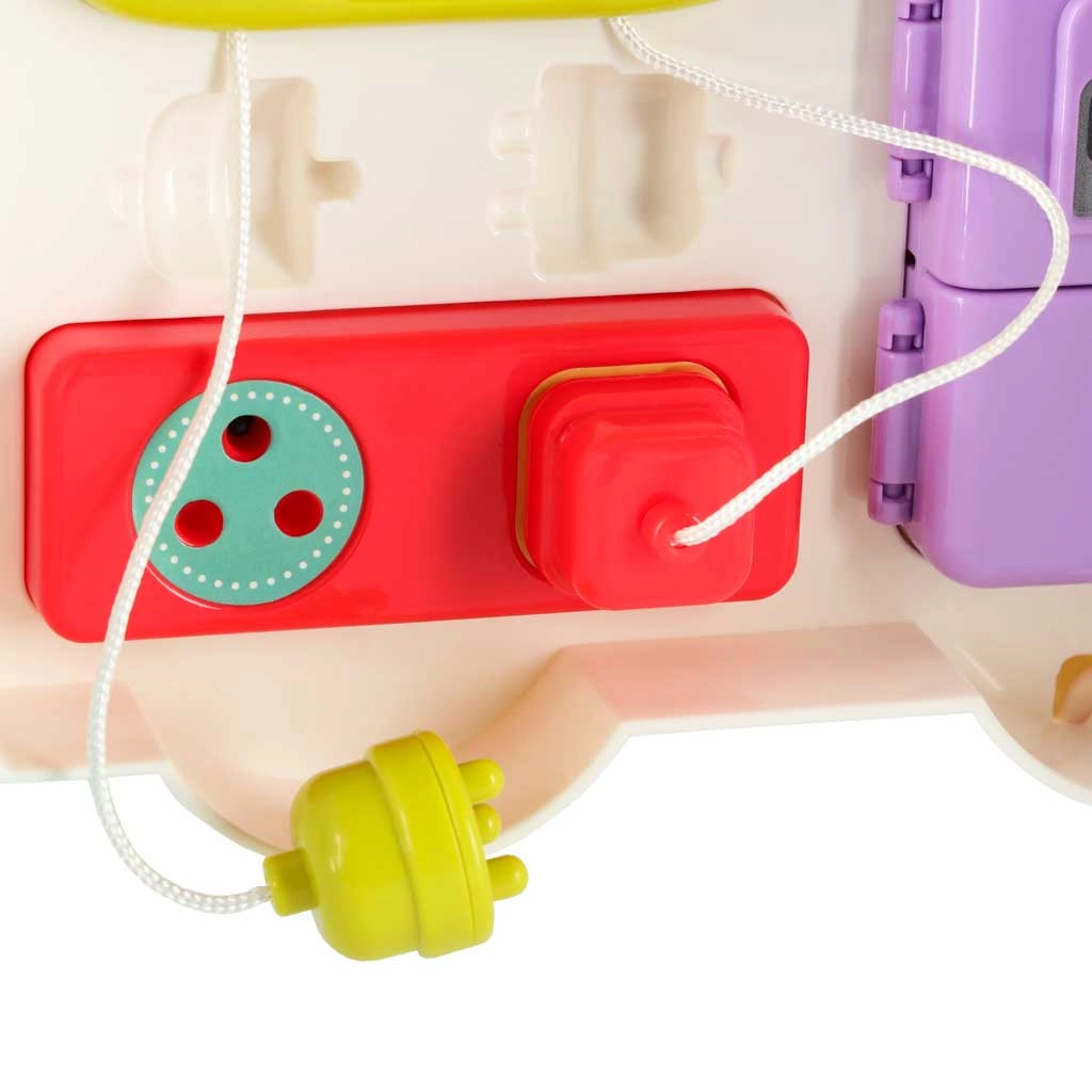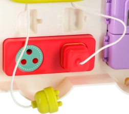 Den åbne bus bliver til et interaktivt panel med knapper, klapper og vinduer. Barnet leger og udvikler samtidig finmotorik og opmærksomhed.
