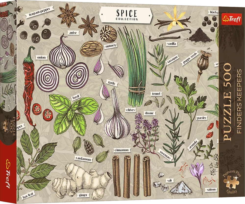 Oplev glæden ved at lægge puslespil med TREFL Premium Plus. Det illustrerede motiv med krydderier og urter vil begejstre enhver, der elsker madlavning og design. Takket være den ekstraordinære Premium Plus-kvalitet, de unikke brikformer og den exceptionelle kartontykkelse er puslespillet nemt at samle og flytte. Der medfølger en forlæg for lettere lægning samt miljøvenlig emballage med FSC-certificering.