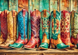 Nyd afslapning med at lægge stilfulde puslespil med motiv af farverige cowboystøvler. Pakken indeholder 1000 brikker og en praktisk plakat for nemmere lægning. Når det er samlet, får du et kvalitetsbillede i størrelsen 68 × 48 cm – ideelt til indramning.
