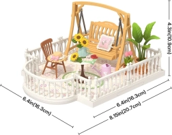 En realistisk gynge med pude, et bord med solsikker og blomster skaber et behageligt sted til afslapning og udstilling af detaljer.
