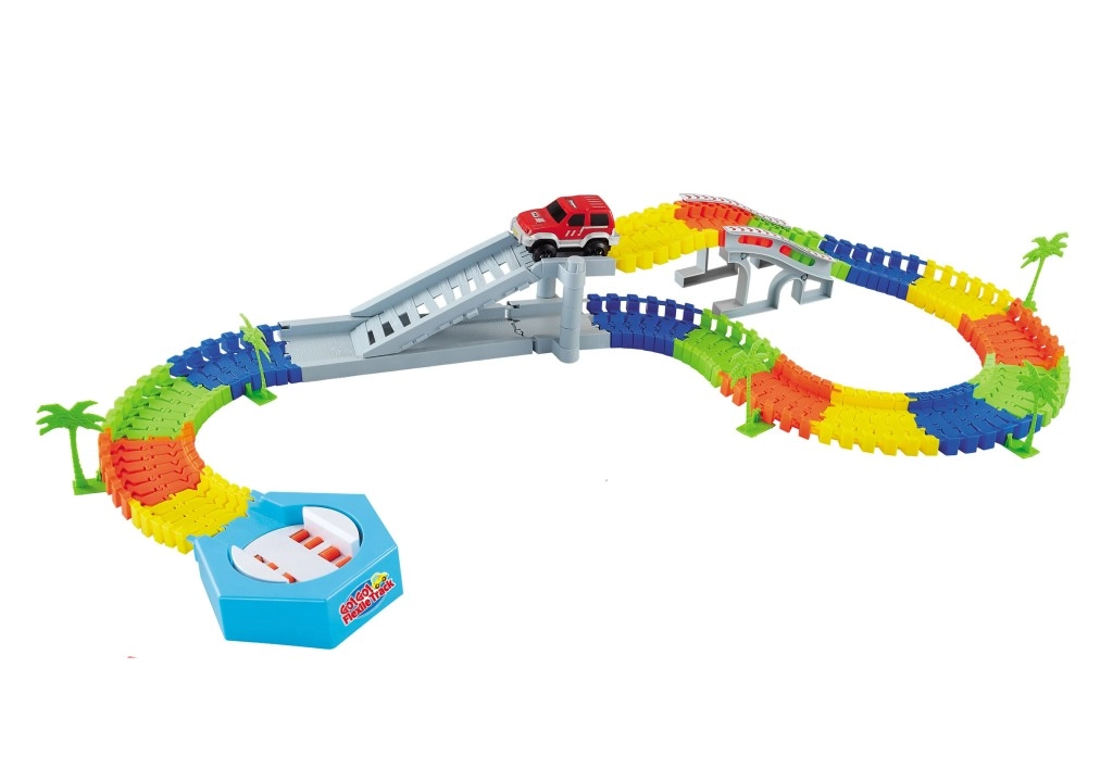 I pakken er der en batteridrevet lille bil, som suser jævnt hen over banen takket være skinnebredde på 7,8 cm. Strømforsyning via 2× 1,5 V AA batterier (medfølger ikke). Banen kan når som helst ombygges og udvides, så legen aldrig bliver kedelig.