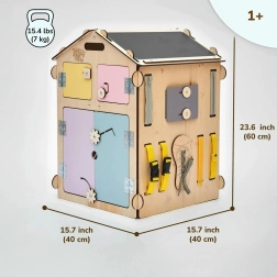 Det pastelfarvede BusyKids activity-hus er et gennemtænkt Montessori-redskab til både tumlinge og førskolebørn. Børn leger i det, gemmer sig og træner samtidig naturligt hånd–øje-koordination, koncentration og tålmodighed. Taget gemmer på en tegnetavle og et puttepuslespil, mens væggene frister med lynlåse, velcro, en touch-lampe, et alarmur, motoriske elementer, knapper, vinduer og døre. At åbne, lukke og putte legetøj ind og ud elsker børn virkelig.