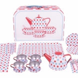 Smukt tesæt med prikker i kuffert er ideelt til små værter. Med et farverigt tesæt i metal, inklusive kande, kopper, bakke og en stilfuld kuffert, bliver enhver tefest en fornøjelse.