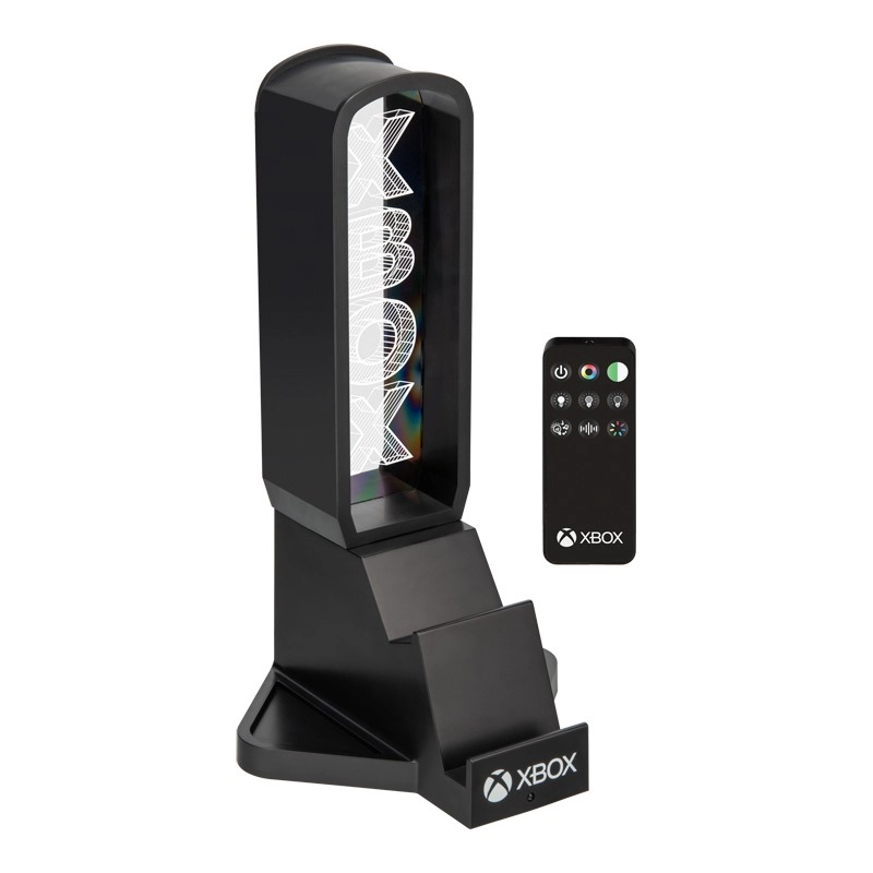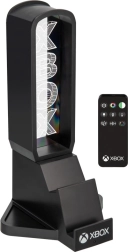Stilfuld spilstander til Xbox med en højde på 30 cm, der leverer LED-belysning med flere tilstande, en praktisk holder til headset og telefon samt 2× USB‑C-porte til opladning af tilbehør. Betjeningen er nem med fjernbetjening, og strømforsyningen sker via USB-kabel inkluderet i pakken.