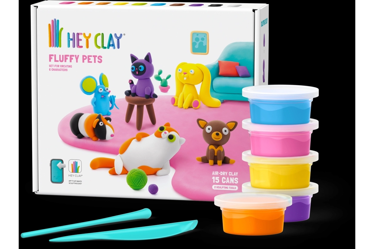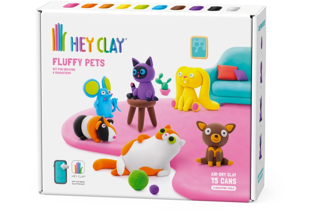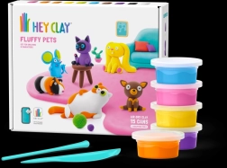 Oplev sjoven med det kreative sæt Hey Clay Fluffy Pets – en pakke med 15 bægre let, velduftende og selvhærdende modellermasse, som gør det nemt for børn at lave søde kæledyr trin for trin. Med den gratis Hey Clay-app (iOS/Android) og den medfølgende kode til at låse vejledninger op kan de lave 6 figurer: 2 hunde, 2 katte, et marsvin og en mus. De færdige modeller hærder i luft og bliver en del af legen. Alder 3+.