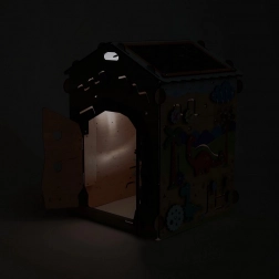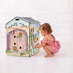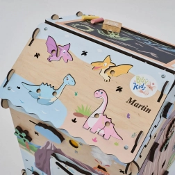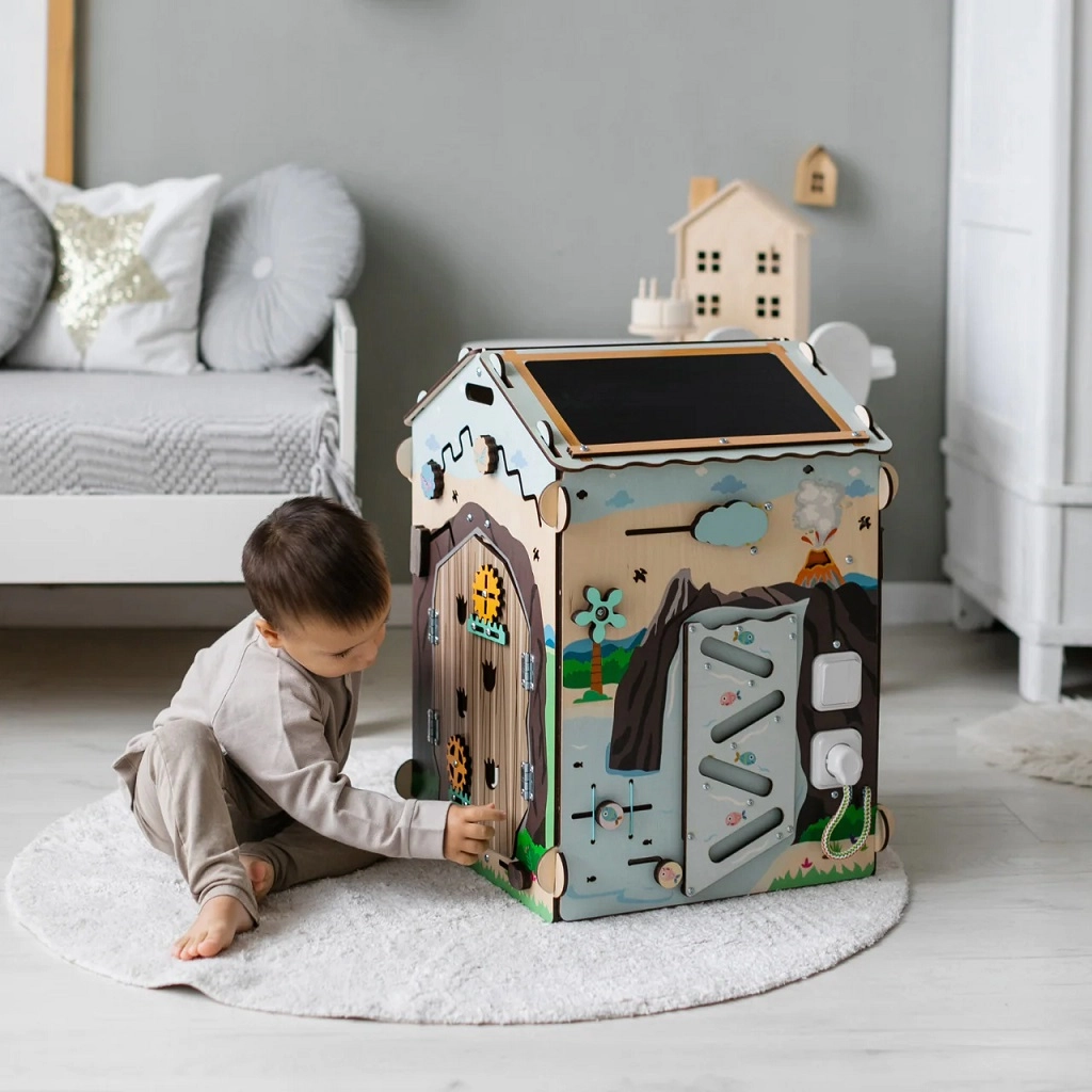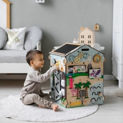 Opdag det sjove og lærerige træ-Montessori hus fra BusyKids med DINO-motiv, som byder på cirka 30 interaktive elementer til udvikling af finmotorik, hånd-øje-koordination og logisk tænkning. Den stabile konstruktion i birkekrydsfiner, sikre vandbaserede lakker, lyseffekter (vulkan og sol) og tavle på taget gør huset til et ideelt valg for både tumlinge og førskolebørn.